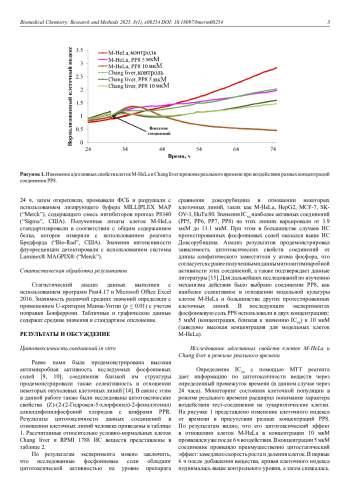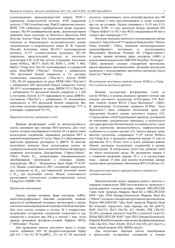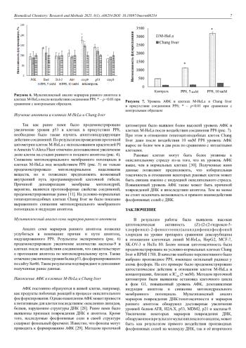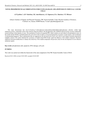 Выявлена высокая цитотоксическая активность (Z)-(2-(2-Гидрокси-5-хлорфенил)-2-фенилэтенил)алкилдифенилфосфоний хлоридов на уровне препарата сравнения доксорубицина. Протестированные фосфониевые соли в большинстве случаев оказались менее токсичными в отношении условно-нормальных клеточных линий. На примере соединения РР8, содержащего октильный радикал при атоме фосфора, показана частичная остановка клеточного цикла в фазе G1, усиленная генерация активных форм кислорода, а также индукция митохондриального апоптоза опухолевых клеток M-HeLa. Экспериментальные данные подтверждаются повышенным уровнем белков р53, р21, H2A. X и каспазы-9, обнаруженным с помощью мультиплексного анализа, и свидетельствуют о возникновении двухцепочечных разрывов ДНК в результате воздействия исследованного соединения. Таким образом, дальнейшие структурные модификации с целью повышения селективности исследуемых соединений позволят рассматривать их в качестве платформы для создания новых эффективных химиотерапевтических агентов.