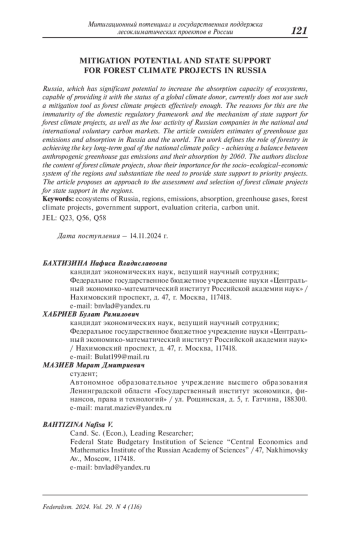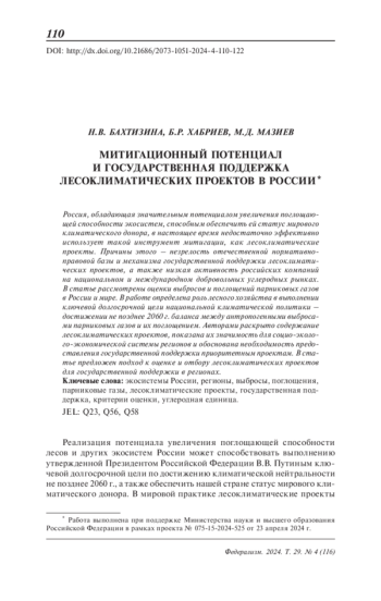 Россия, обладающая значительным потенциалом увеличения поглощаю - щей способности экосистем, способным обеспечить ей статус мирового климатического донора, в настоящее время недостаточно эффективно использует такой инструмент митигации, как лесоклиматические проекты. Причины этого – незрелость отечественной нормативноправовой базы и механизма государственной поддержки лесоклиматических проектов, а также низкая активность российских компаний на национальном и международном добровольных углеродных рынках. В статье рассмотрены оценки выбросов и поглощений парниковых газов в России и мире. В работе определена роль лесного хозяйства в выполнении ключевой долгосрочной цели национальной климатической политики – достижении не позднее 2060 г. баланса между антропогенными выбросами парниковых газов и их поглощением. Авторами раскрыто содержание лесоклиматических проектов, показана их значимость для социо-эколого-экономической системы регионов и обоснована необходимость предо - ставления государственной поддержки приоритетным проектам. В статье предложен подход к оценке и отбору лесоклиматических проектов для государственной поддержки в регионах.