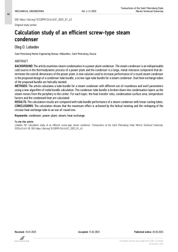 5. Лебедев О.О. Алгоритм расчета винтового конденсатора пара // Судостроение. 2020. № 5. С. 23–25. EDN: PUXITH
