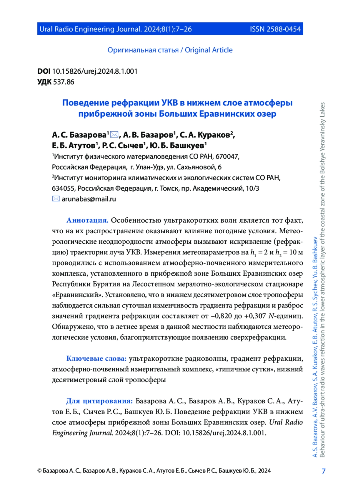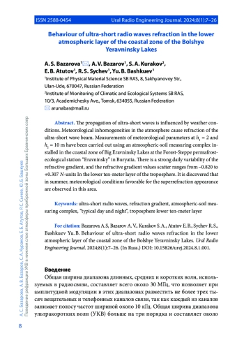 Особенностью ультракоротких волн является тот факт, что на их распространение оказывают влияние погодные условия. Метеорологические неоднородности атмосферы вызывают искривление (рефракцию) траектории луча УКВ. Измерения метеопараметров на h1 = 2 и h2 = 10 м проводились с использованием атмосферно-почвенного измерительного комплекса, установленного в прибрежной зоне Больших Еравнинских озер Республики Бурятия на Лесостепном мерзлотно-экологическом стационаре «Еравнинский». Установлено, что в нижнем десятиметровом слое тропосферы наблюдается сильная суточная изменчивость градиента рефракции и разброс значений градиента рефракции составляет от -0,820 до +0,307 N-единиц. Обнаружено, что в летнее время в данной местности наблюдаются метеорологические условия, благоприятствующие появлению сверхрефракции.