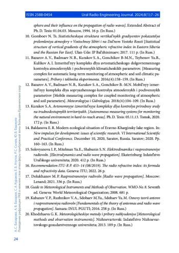 9. Жамсуева Г. С. Радиометеорологические параметры полярной тропосферы и их влияние на распространение радиоволн. Автореф. дис. … канд. физ.-мат. наук: 01.04.03. Москва, 1994. 16 с. EDN: ZJTUXD