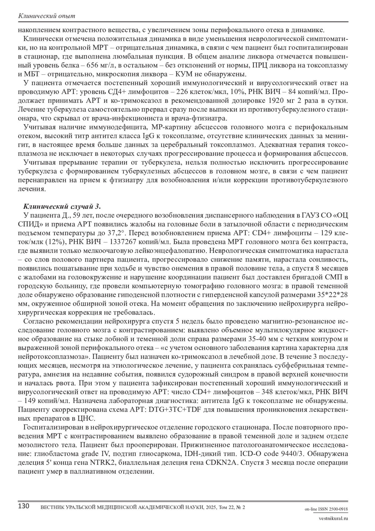 Поражения центральной нервной системы (ЦНС) являются важной и актуальной проблемой, связанной с ВИЧ-инфекцией. Основной и самой частой причиной поражения ЦНС у больных ВИЧ-инфекцией является токсоплазмоз головного мозга, который развивается, как правило, без приема антиретровирусной терапии. Цель исследования – проанализировать клинические варианты поражений ЦНС при ВИЧ-инфекции у амбулаторных пациентов с обоснованием дифференциальной диагностики и междисциплинарного взаимодействия специалистов, имеющих компетенции в области ВИЧ-инфекции. Материалы и методы. Представлены описания клинических наблюдений за тремя пациентами Свердловского областного центра профилактики и борьбы со СПИД с поражением головного мозга на фоне ВИЧ-инфекции, результаты инструментальной и лабораторной диагностики. Результаты и заключение. Обсуждены сложности дифференциальной диагностики образований головного мозга и последующего лечения у пациентов с поражением ЦНС при ВИЧ-инфекции. При прогрессировании ВИЧ-инфекции поражение центральной нервной системы может быть связано с широким спектром этиологических факторов. Постановка диагноза для клинициста амбулаторного звена является сложной задачей и требует комплексного обследования пациента. Основные причины поражения ЦНС, как правило, напрямую связаны с инфекционным фактором. Помимо определения этиологии инфекционного процесса следует исключить опухолевое поражение головного мозга. Для своевременной дифференциальной диагностики при постановке окончательного диагноза целесообразно междисциплинарное взаимодействие специалистов, имеющих компетенции в области ВИЧинфекции.