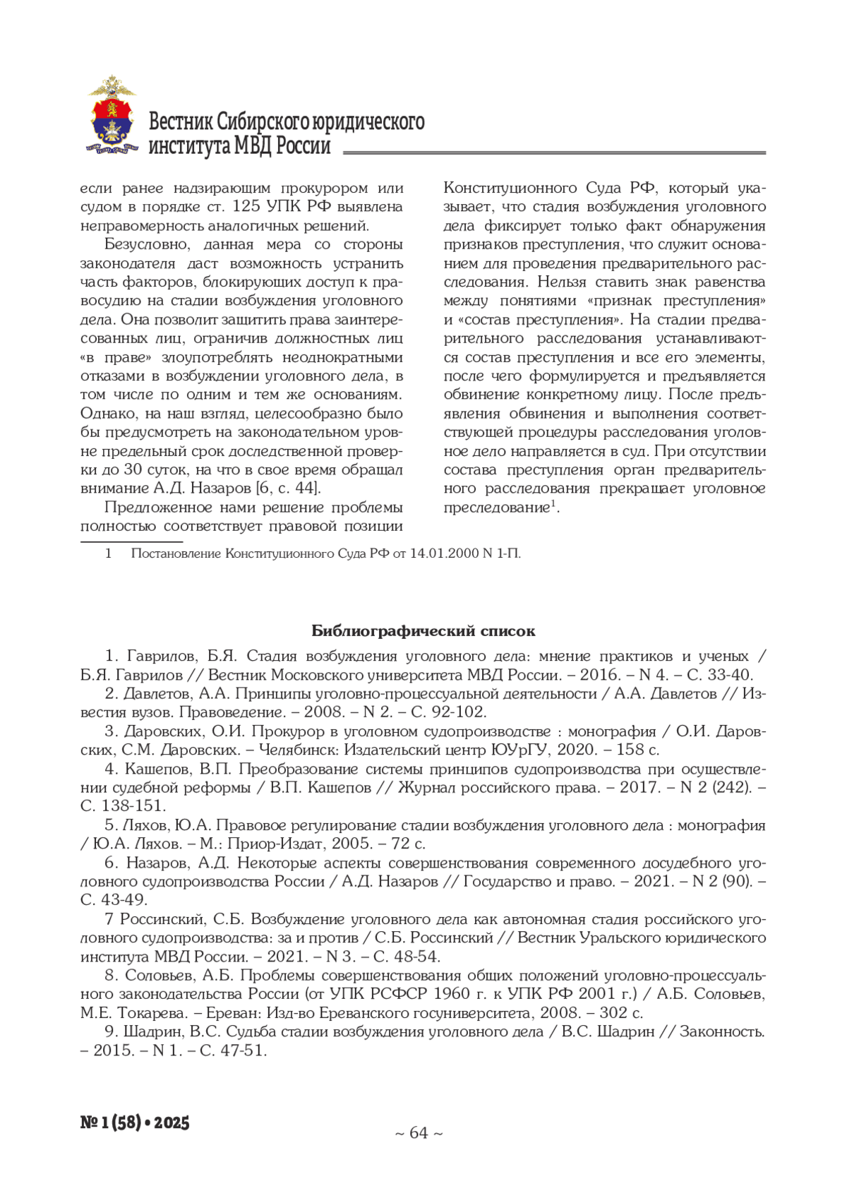1. Гаврилов, Б.Я. Стадия возбуждения уголовного дела: мнение практиков и ученых / Б.Я. Гаврилов // Вестник Московского университета МВД России. - 2016. - N 4. - С. 33-40.