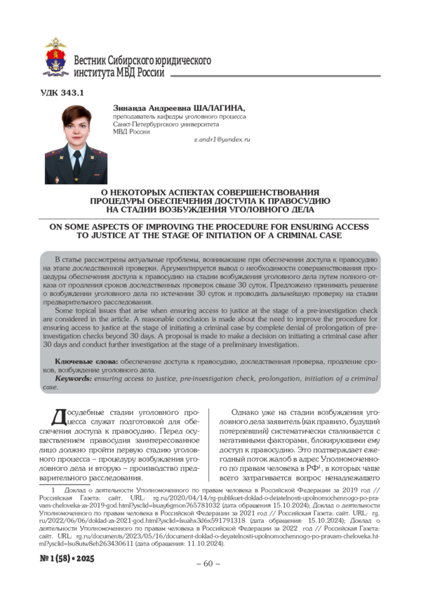 В статье рассмотрены актуальные проблемы, возникающие при обеспечении доступа к правосудию на этапе доследственной проверки. Аргументируется вывод о необходимости совершенствования процедуры обеспечения доступа к правосудию на стадии возбуждения уголовного дела путем полного отказа от продления сроков доследственных проверок свыше 30 суток. Предложено принимать решение о возбуждении уголовного дела по истечении 30 суток и проводить дальнейшую проверку на стадии предварительного расследования.