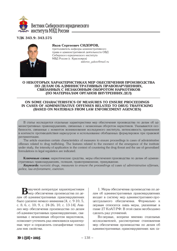 7. Сидоров, Я.С. Использование оценочных формулировок при реализации сотрудниками полиции мер обеспечения производства по делам об административных правонарушениях, связанных с незаконным оборотом наркотиков / Я.С. Сидоров // Научный вестник Орловского юридического института МВД России имени В.В. Лукьянова. - 2023. - N 3(96). - С. 78-84. EDN: HHXCWI