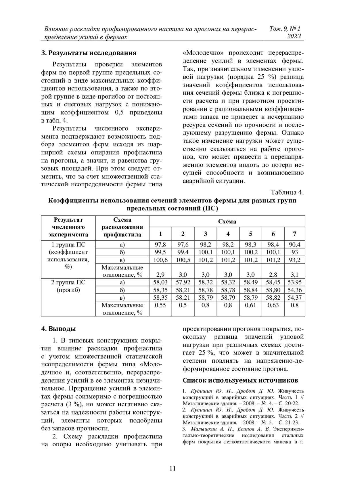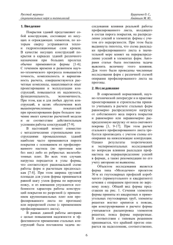 Статья посвящена анализу влияния расположения профилированного настила с учетом его неразрезной работы на перераспределение усилий в фермах. В качестве объекта исследования приняты фермы типа «Молодечно» пролетом 30 м из гнутосварных профилей коробчатого сечения. В зависимости от конфигурации кровли сформированы 7 расчетных случаев. В каждом случае сначала производится подбор сечений элементов фермы без учета работы профилированного листа, а затем - проверка с учетом расположения профилированного настила на прогонах. Выполнено сравнение результатов численных экспериментов, в частности узловые нагрузки и коэффициенты использования сечений. Приведенные данные обосновывают вывод о необходимости учета работы профилированного настила при расчете элементов покрытия.
