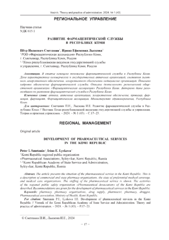В статье освещено положение фармацевтической службы в Республике Коми. Дана характеристика коммерческих и государственных аптечных организаций, состояния льготного лекарственного обеспечения, лекарственного обеспечения медицинских организаций. Показано кадровое обеспечение фармацевтической службы. Описана деятельность региональной общественной организации «Фармацевтическая ассоциация» Республики Коми. Авторами даны рекомендации по развитию фармацевтической службы в Республике Коми.