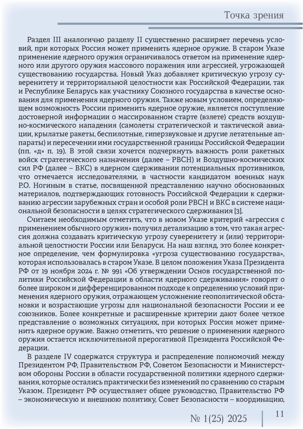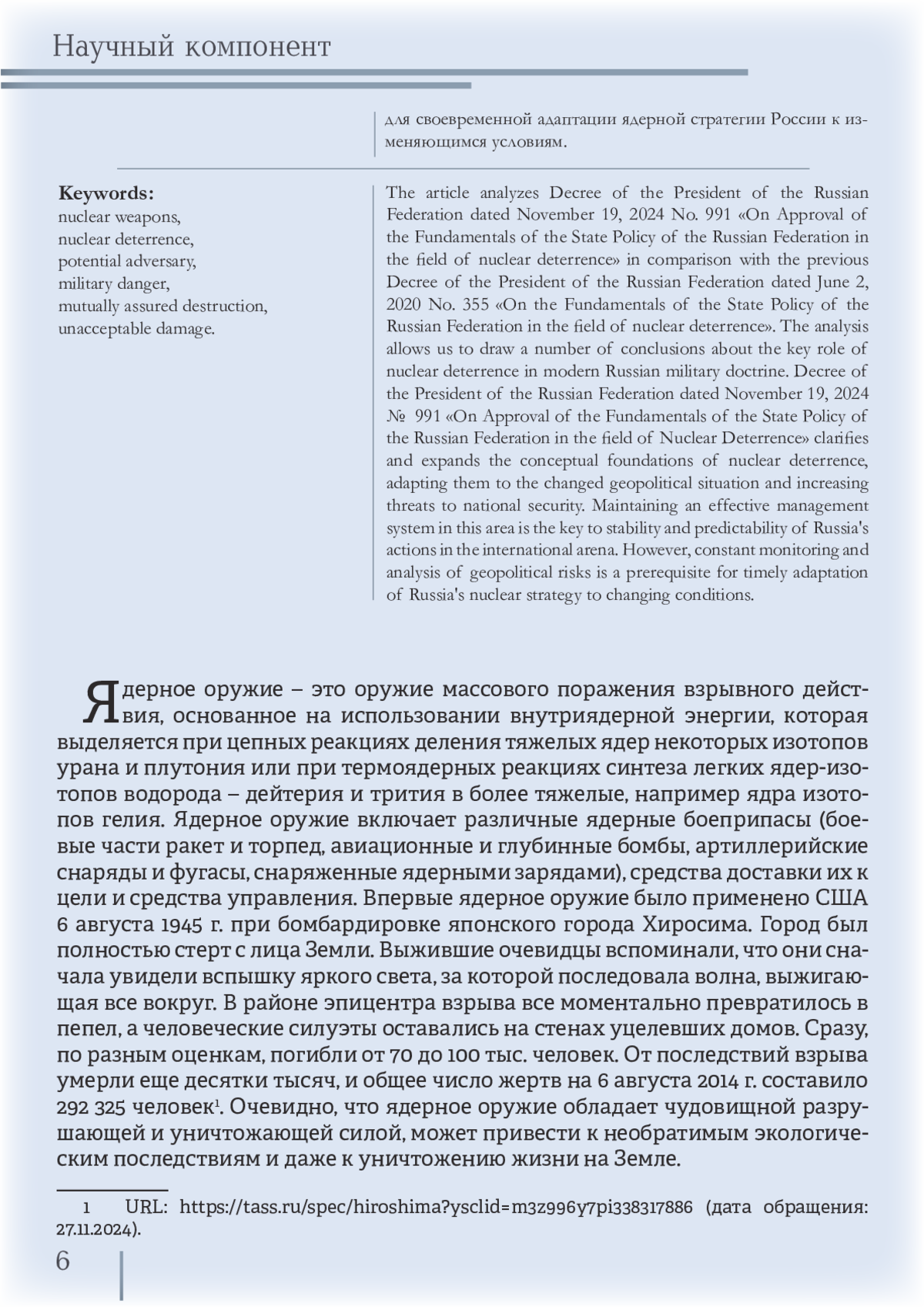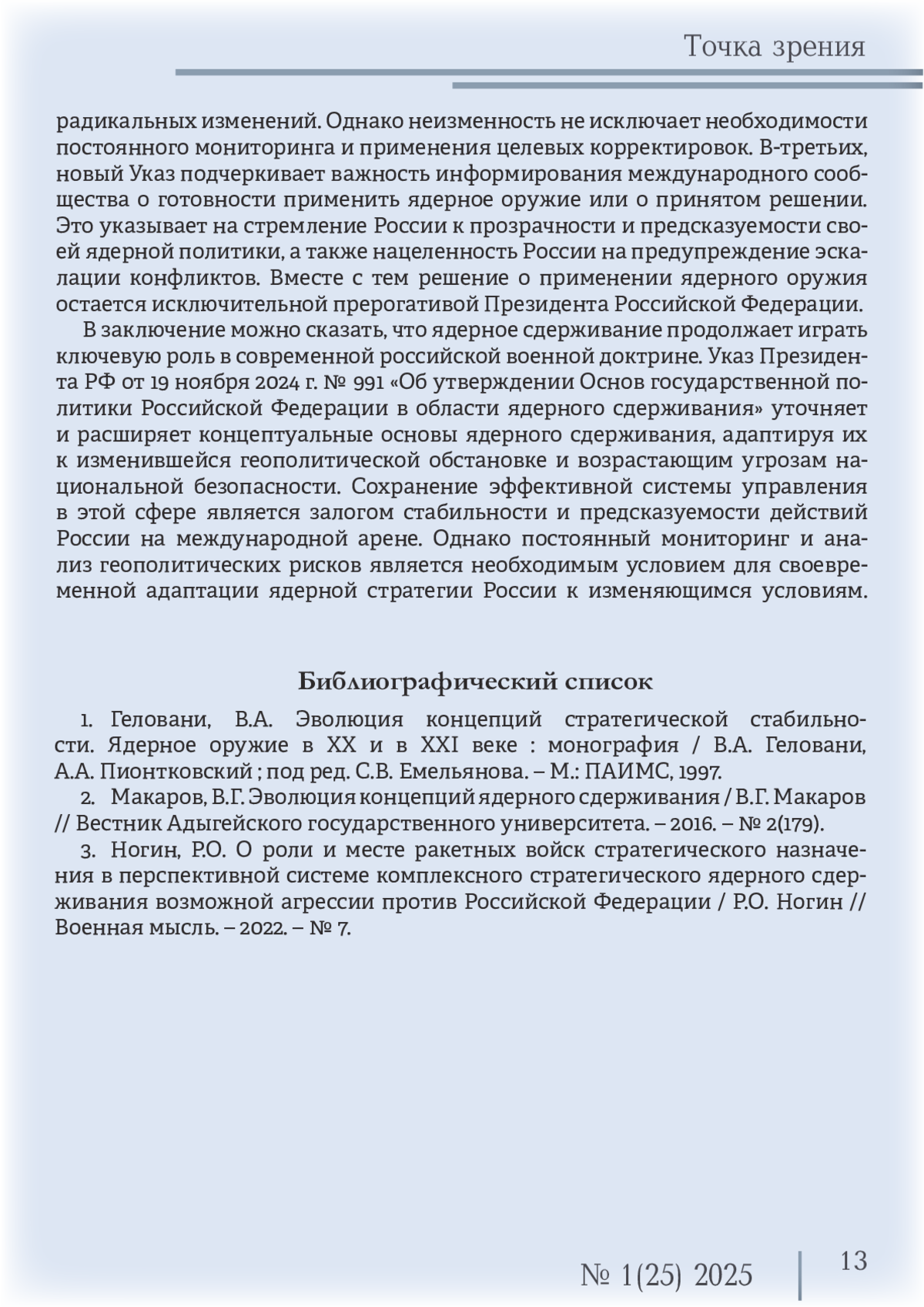Проведенный анализ позволяет сделать ряд выводов о ключевой роли ядерного сдерживания в современной российской военной доктрине. Указ Президента РФ от 19 ноября 2024 г. № 991 «Об утверждении Основ государственной политики Российской Федерации в области ядерного сдерживания» уточняет и расширяет концептуальные основы ядерного сдерживания, адаптируя их к изменившейся геополитической обстановке и возрастающим угрозам национальной безопасности. Сохранение эффективной системы управления в этой сфере является залогом стабильности и предсказуемости действий России на международной арене.
