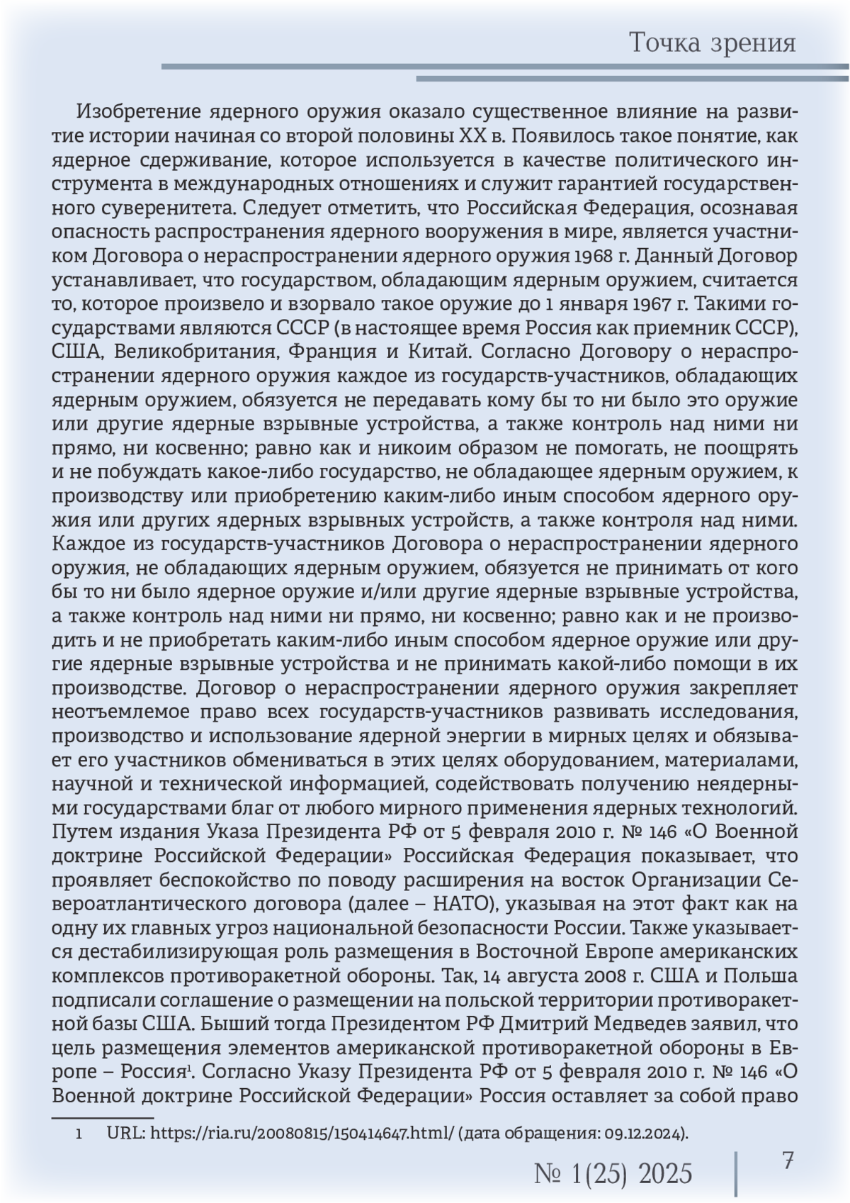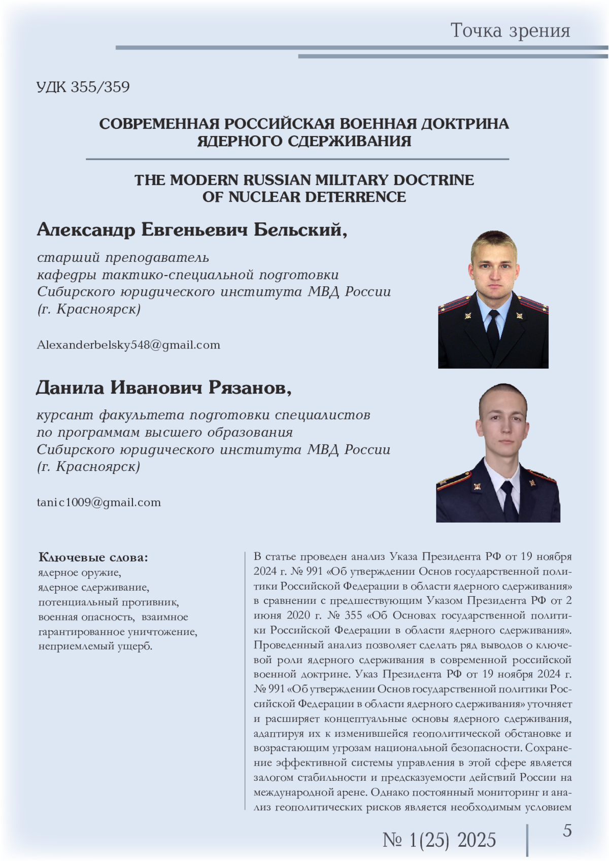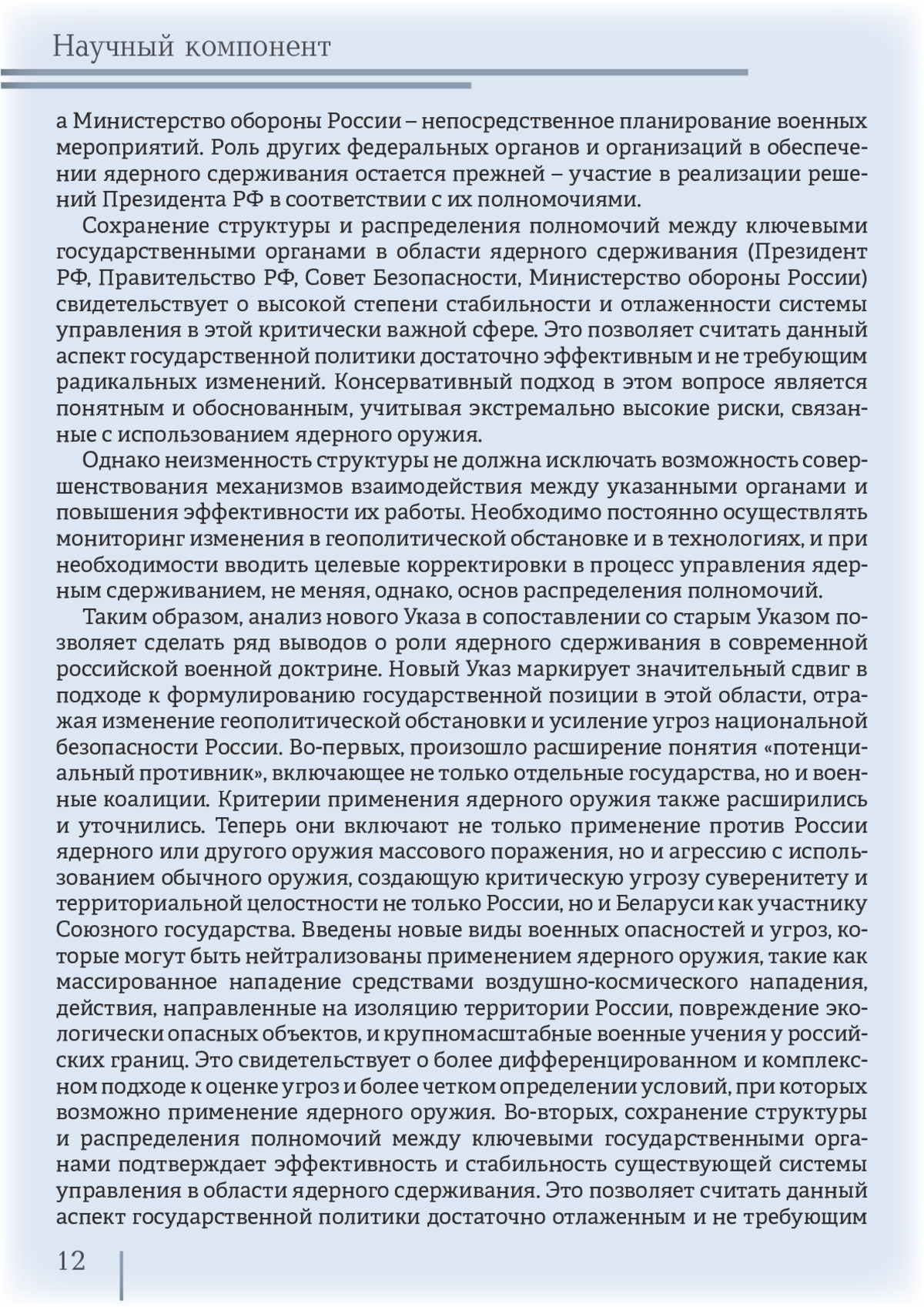 Проведенный анализ позволяет сделать ряд выводов о ключевой роли ядерного сдерживания в современной российской военной доктрине. Указ Президента РФ от 19 ноября 2024 г. № 991 «Об утверждении Основ государственной политики Российской Федерации в области ядерного сдерживания» уточняет и расширяет концептуальные основы ядерного сдерживания, адаптируя их к изменившейся геополитической обстановке и возрастающим угрозам национальной безопасности. Сохранение эффективной системы управления в этой сфере является залогом стабильности и предсказуемости действий России на международной арене.