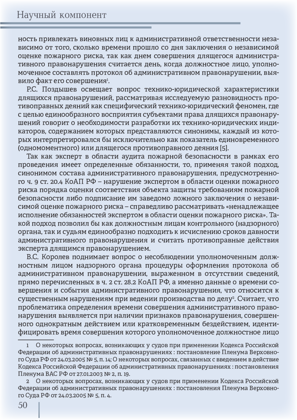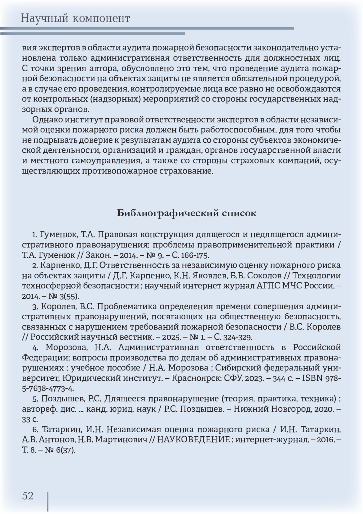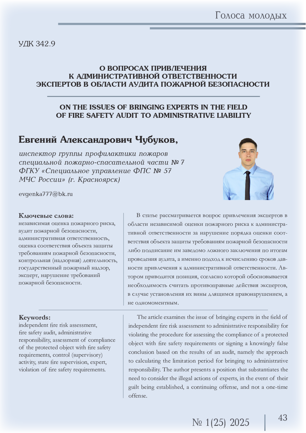 ЧУБУКОВ Е. А. О ВОПРОСАХ ПРИВЛЕЧЕНИЯ К АДМИНИСТРАТИВНОЙ ОТВЕТСТВЕННОСТИ ЭКСПЕРТОВ В ОБЛАСТИ АУДИТА ПОЖАРНОЙ БЕЗОПАСНОСТИ // НАУЧНЫЙ КОМПОНЕНТ. 2025. № 1 (25)