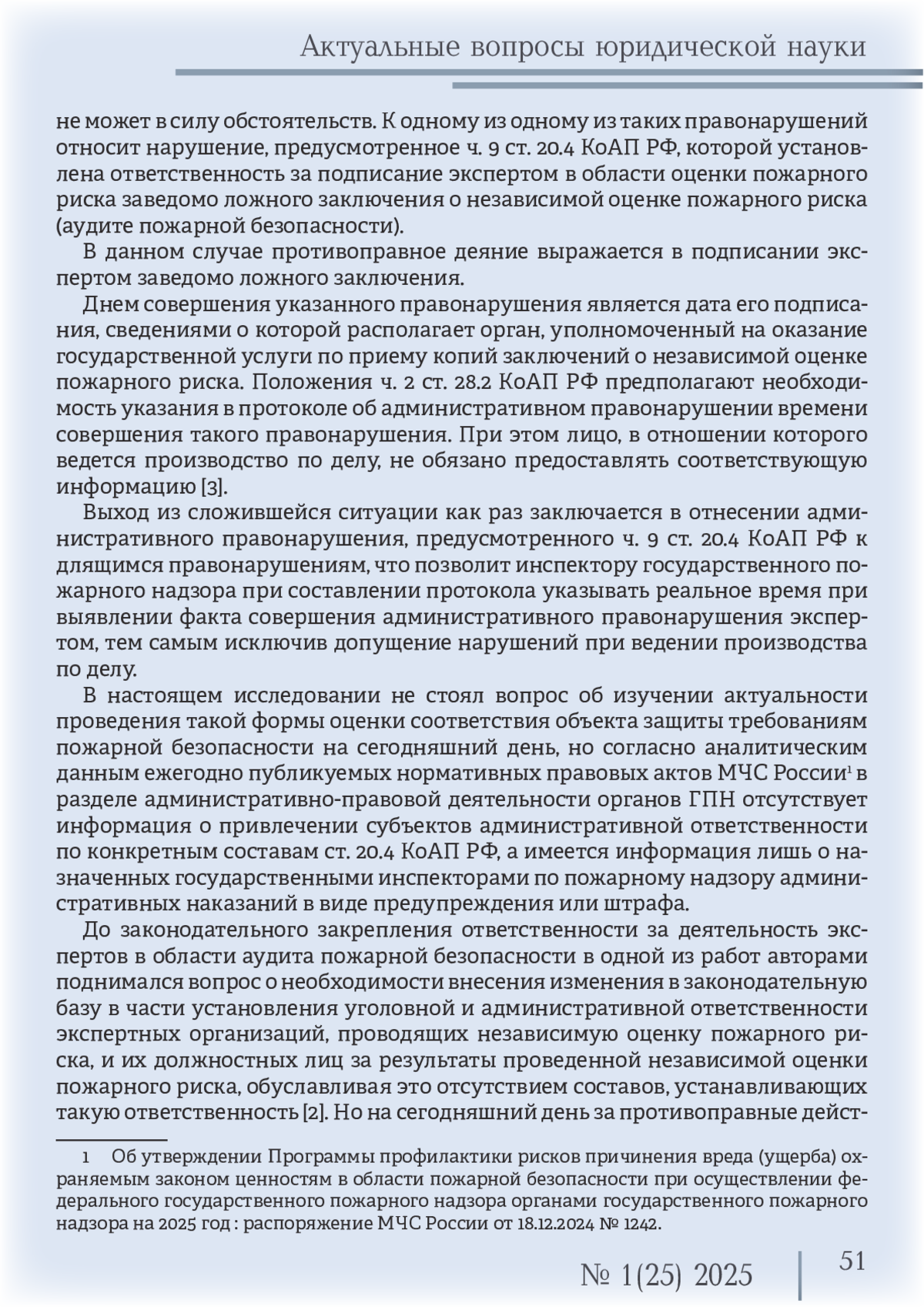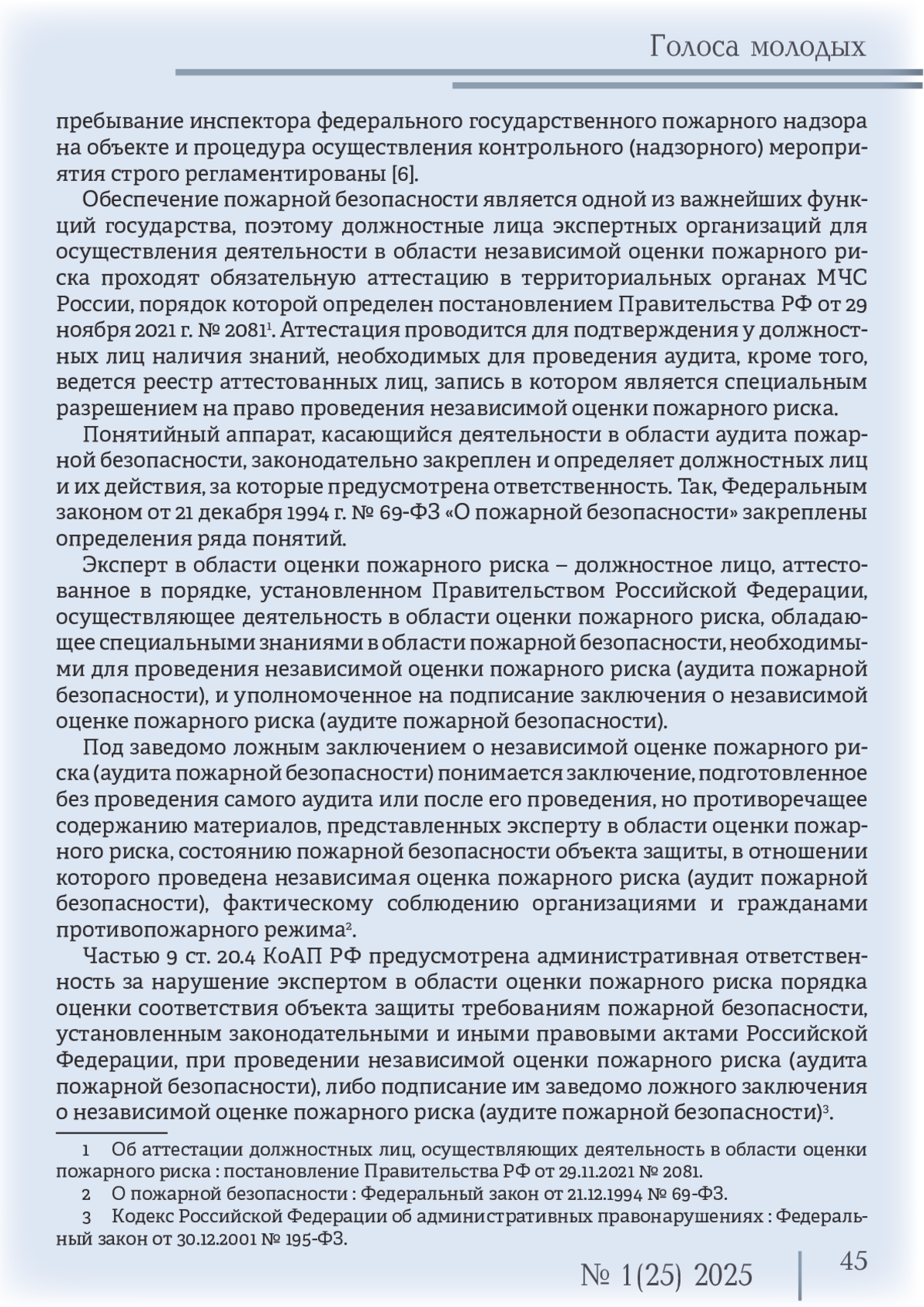 Статья: О ВОПРОСАХ ПРИВЛЕЧЕНИЯ К АДМИНИСТРАТИВНОЙ ОТВЕТСТВЕННОСТИ ЭКСПЕРТОВ В ОБЛАСТИ АУДИТА ПОЖАРНОЙ БЕЗОПАСНОСТИ (2025)