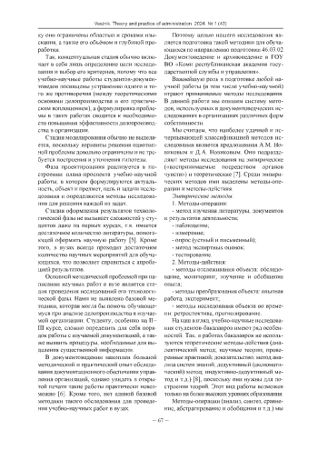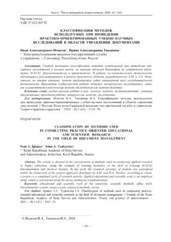 Статья посвящена классификации методов, используемых при проведении прикладных исследований в высшей школе, на примере обучения бакалавров по направлению подготовки 46.03.02 Документоведение и архивоведение. В работе исследовательская деятельность обучающихся рассматривается в рамках проектного подхода, разработанного А. М. и Д. А. Новиковыми, по мнению которых, проект представляет собой завершённый цикл исследовательской деятельности. Прикладная учебно-научная работа является эмпирическим исследованием, которое осуществляется при помощи метода обследования как метода-действия.