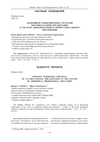 Так, в исследованиях Е. В. Самсоновой [1] разработка адаптивной маркетинговой стратегии любой организации основывается на полноте информации о внешней и внутренней среде, когда имеется конкурентоспособный продукт, руководящий состав и учредители организации заинтересованы в долгосрочном развитии организации. Для того, чтобы образовательная организация высшего образования смогла в ближайшей перспективе адаптироваться к новым условиям, необходимо создать определённые предпосылки. Именно усиление позиций организации в сегменте реализации программ дополнительного профессионального образования позволит более эффективно реагировать на постоянные изменения внешней среды.
