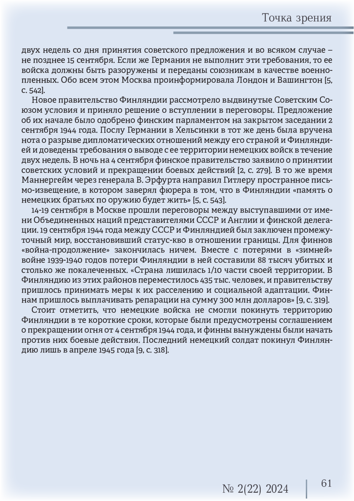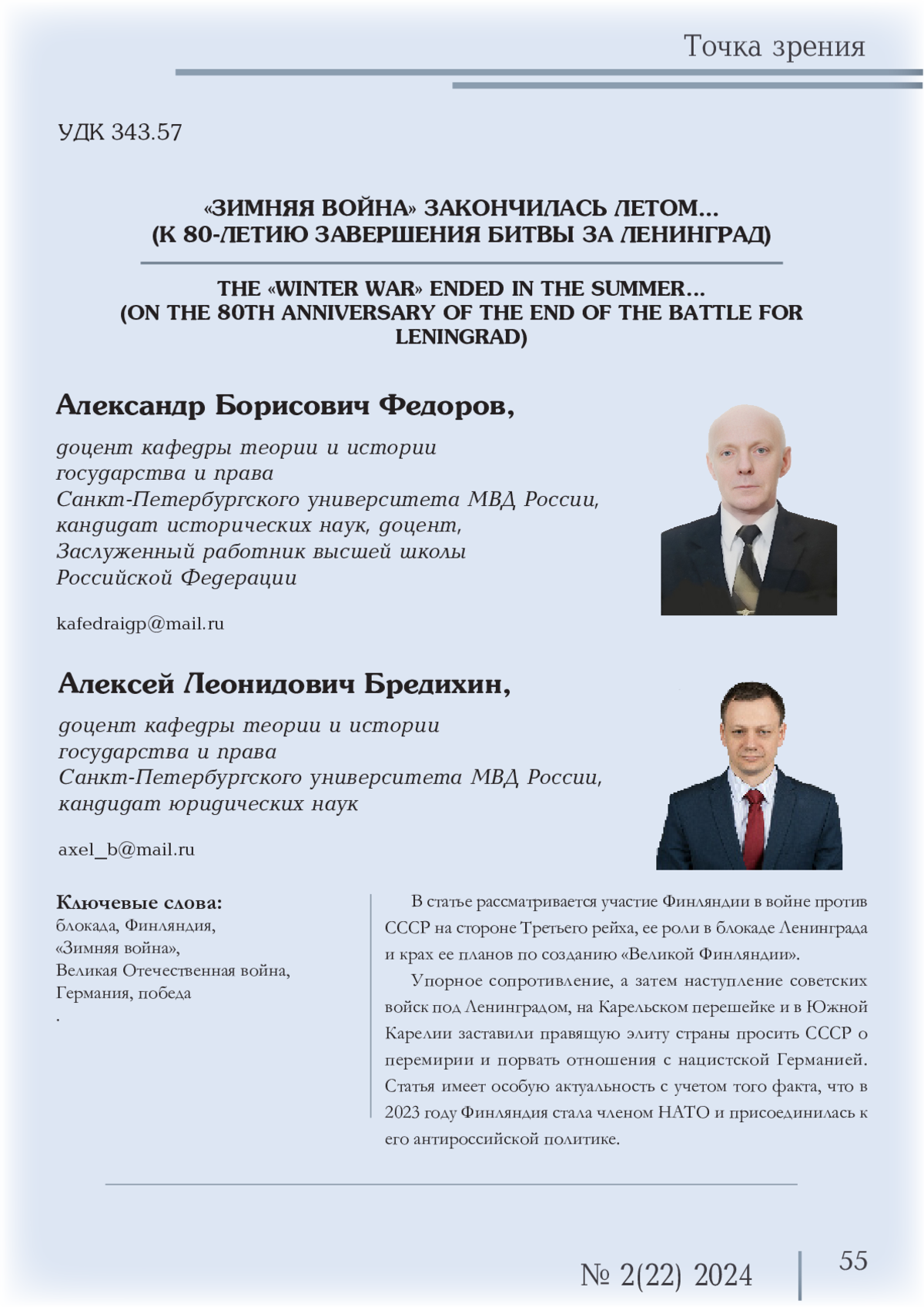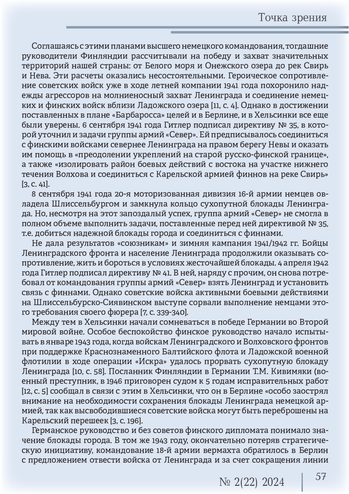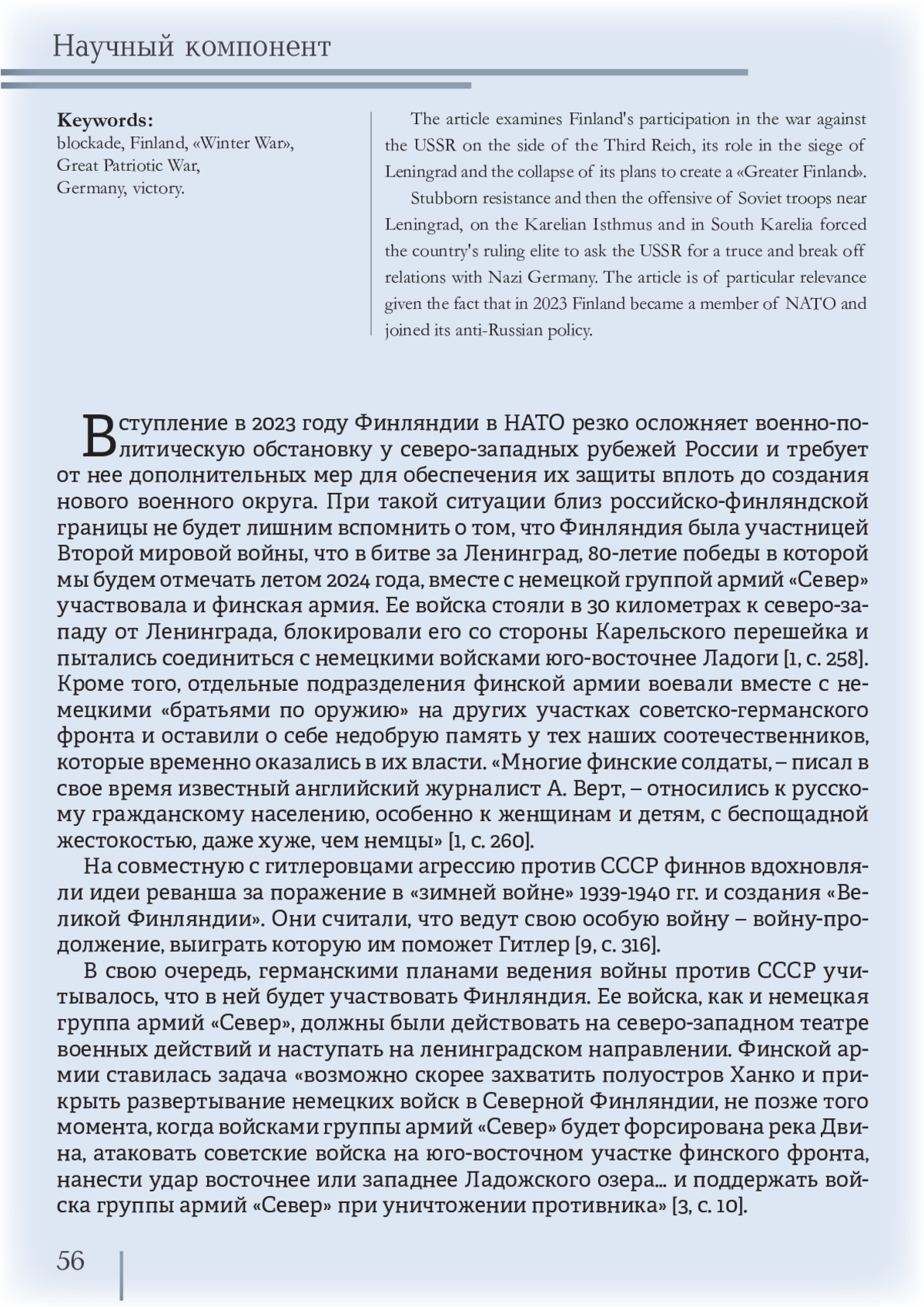 Вступление в 2023 году Финляндии в НАТО резко осложняет военно-политическую обстановку у северо-западных рубежей России и требует от нее дополнительных мер для обеспечения их защиты вплоть до создания нового военного округа. При такой ситуации близ российско-финляндской границы не будет лишним вспомнить о том, что Финляндия была участницей Второй мировой войны, что в битве за Ленинград, 80-летие победы в которой мы будем отмечать летом 2024 года, вместе с немецкой группой армий «Север» участвовала и финская армия. Ее войска стояли в 30 километрах к северо-западу от Ленинграда, блокировали его со стороны Карельского перешейка и пытались соединиться с немецкими войсками юго-восточнее Ладоги [1, с. 258]. Кроме того, отдельные подразделения финской армии воевали вместе с немецкими «братьями по оружию» на других участках советско-германского фронта и оставили о себе недобрую память у тех наших соотечественников, которые временно оказались в их власти. «Многие финские солдаты, – писал в свое время известный английский журналист А. Верт, – относились к русскому гражданскому населению, особенно к женщинам и детям, с беспощадной жестокостью, даже хуже, чем немцы» [1, с. 260].