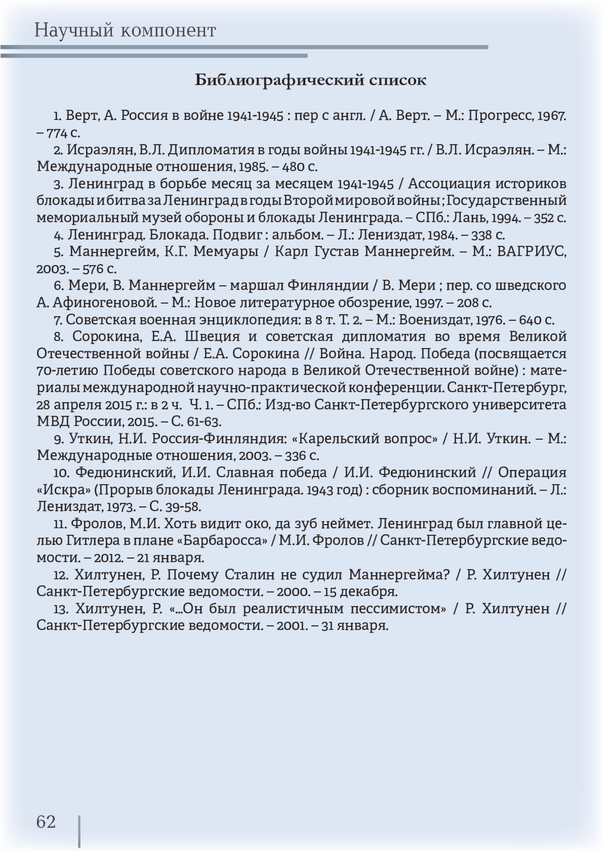 8. Сорокина, Е.А. Швеция и советская дипломатия во время Великой Отечественной войны / Е.А. Сорокина // Война. Народ. Победа (посвящается 70-летию Победы советского народа в Великой Отечественной войне): материалы международной научно-практической конференции. Санкт-Петербург, 28 апреля 2015 г.: в 2 ч. Ч. 1. - СПб.: Изд-во Санкт-Петербургского университета МВД России, 2015. - С. 61-63. EDN: TRYMQB