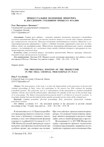 Главная цель работы - показать правовое положение прокурора в досудебном уголовном производстве Италии, где данный участник процесса в полной мере сохранил руководящее процессуальное положение. Прокурор выступает представителем стороны обвинения в уголовно-процессуальных отношениях с судом и судебной полицией, определяет исход дела на досудебном этапе его разбирательства. Итальянская прокурорско-обвинительная модель вызывает интерес у исследователей, т. к. исключает споры между судебной полицией и прокурором по ключевым вопросам уголовного дела.
