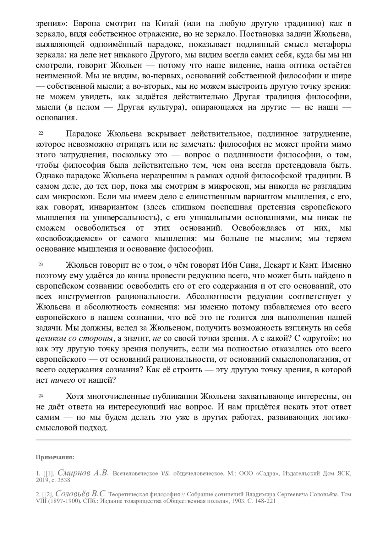 1. Смирнов А.В. Всечеловеческое vs. общечеловеческое. М.: ООО “Садра”, Издательский Дом ЯСК, 2019. EDN: TOMQRN