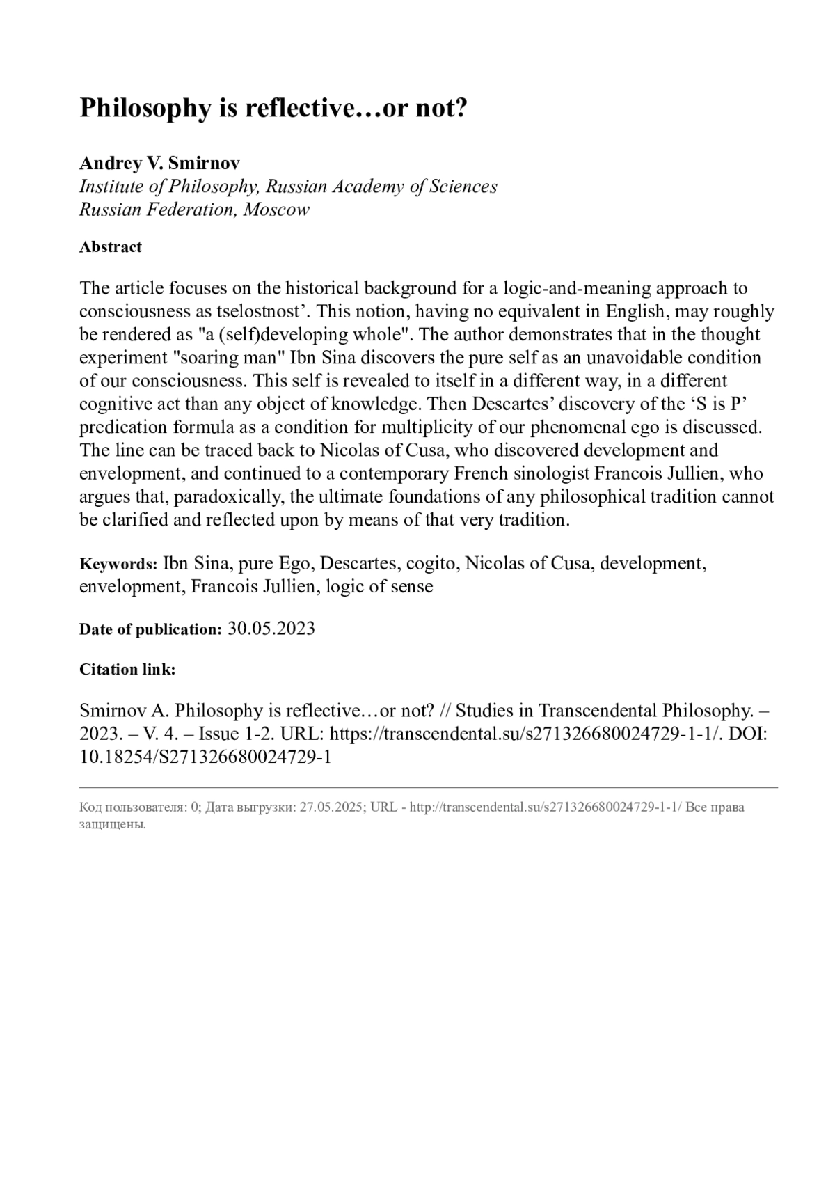 Рассмотрены исторические предпосылки логико-смыслового подхода к сознанию как беспредпосылочной (само)разворачивающейся целостности. В мысленном эксперименте «парящий человек» Ибн Сина открывает чистое Я как неустранимое условие нашего сознания и как явленное самому себе иначе, в ином познавательном акте, нежели любой предмет познания. Декарт открывает предикационную формулу «S есть P» как условие феноменального я. Николай Кузанский открывает сворачивание и разворачивание. Современный французский китаист Ф. Жюльен фактически формулирует парадокс, согласно которому основания философской традиции не могут быть выявлены самой этой традицией.