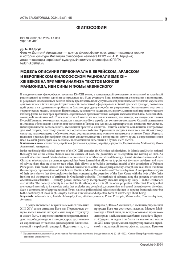 В средневековых философских течениях IX-XIII веков, в христианской схоластике, в исламской и иудейской рациональной теологии одной из центральных тем была сущность Бога, возможность ее познания и именования. В результате многовековых дебатов между представителями мусульманской рациональной теологии, еврейского аристотелизма и более поздней христианской схоластикой сформировался общий для всех дискурс, позволяющий указать на одинаковые проблемы и близкие друг другу способы их разрешения. Это позволяет построить теоретическую модель описания Первоначала, основанную на детальном продумывании идей перипатетического гилеморфизма во всех трех традициях, образцовыми представителями которых являются Ибн Сина, Моисей Маймонид и Фома Аквинский. Сопоставительный анализ их текстов показывает, что выводы, касающиеся познания Первой Причины конечным интеллектом и наличия у Бога атрибутов, во многом совпадают. Схожей оказывается и методика обоснования наличия или отсутствия в Творце тех или иных характеристики: вечности, могущества, нематериальности, бестелесности, абсолютной простоты, единства. Понятие единства есть понятие центральное для этой теории, поскольку именно все остальные свойства Первоначала сводятся именно к его абсолютному единству, исключающему любую сложность, составленность и причинную зависимость от иного. Такая общность подходов в разных философских традициях свидетельствует не о копировании друг у друга, а о преемственности идей в самой философии как всеобщем и объективном виде знания о сущем и его бытии.