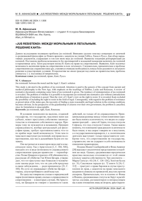 АФАНАСЬЕВ М. В. JUS RESISTENDI: МЕЖДУ МОРАЛЬНЫМ И ЛЕГАЛЬНЫМ. РЕШЕНИЕ КАНТА // ACTA ERUDITORUM. 2024. № 45