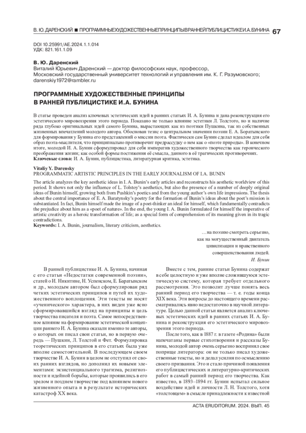 ДАРЕНСКИЙ В. Ю. ПРОГРАММНЫЕ ХУДОЖЕСТВЕННЫЕ ПРИНЦИПЫ В РАННЕЙ ПУБЛИЦИСТИКЕ И. А. БУНИНА // ACTA ERUDITORUM. 2024. № 45