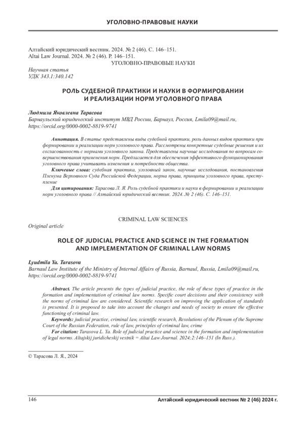 Судебная практика и наука играют ключевую роль в формировании и реализации норм уголовного права. Взаимодействие между судебной практикой и научным знанием способствует развитию законодательства, правоприменения, а также совершенствованию самой уголовной системы. Проблемы применения норм уголовного права в судебной практике всегда вызывали интерес у теоретиков. Сейчас можно говорить о том, что единства в судебной практике не достигнуто, а правовые средства ее достижения недостаточны и слабо изучены. Существует необходимость в рассмотрении принципов единства судебной практики и науки уголовного права в формировании и реализации норм. В представленной работе мы попытались выявить те элементы, которые влияют на реализацию норм уголовного права.