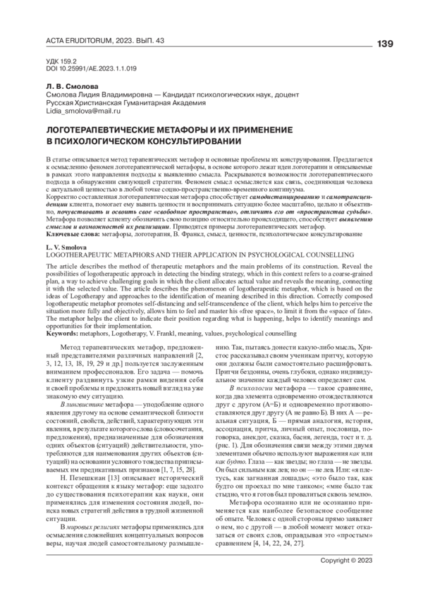 16. Смолова Л. В. Подходы к выявлению смысла в логотерапии В. Франкла//Ученые Записки СПбГИПИСР. - 2020. - вып. 2. - том 34. - с. 19-29. EDN: YLOJZL