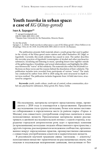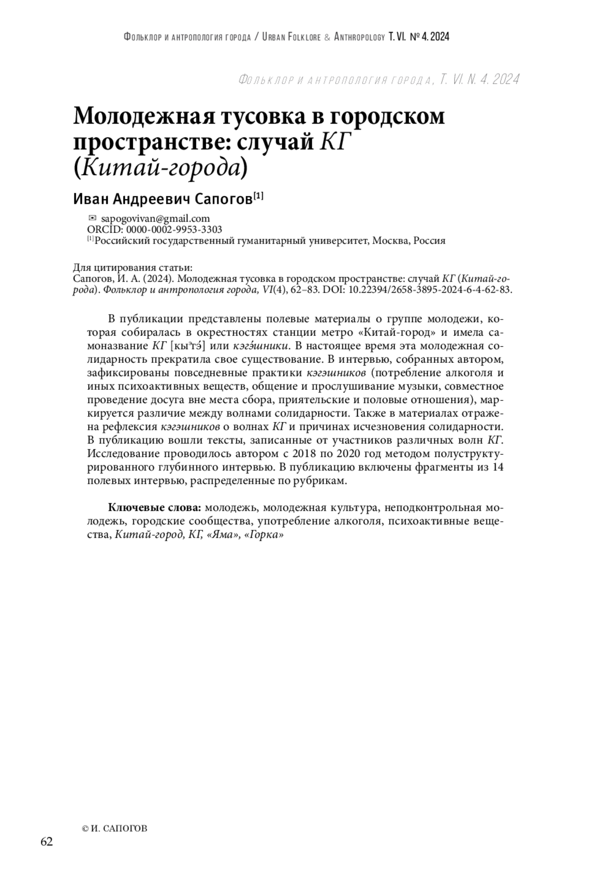 В публикации представлены полевые материалы о группе молодежи, которая собиралась в окрестностях станции метро «Китай-город» и имела самоназвание КГ [кы э гэ՛] или кэгэ՛шники. В настоящее время эта молодежная солидарность прекратила свое существование. В интервью, собранных автором, зафиксированы повседневные практики кэгэшников (потребление алкоголя и иных психоактивных веществ, общение и прослушивание музыки, совместное проведение досуга вне места сбора, приятельские и половые отношения), маркируется различие между волнами солидарности. Также в материалах отражена рефлексия кэгэшников о волнах КГ и причинах исчезновения солидарности. В публикацию вошли тексты, записанные от участников различных волн КГ. Исследование проводилось автором с 2018 по 2020 год методом полуструктурированного глубинного интервью. В публикацию включены фрагменты из 14 полевых интервью, распределенные по рубрикам.