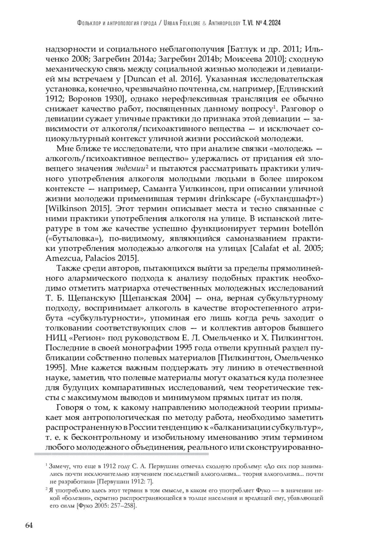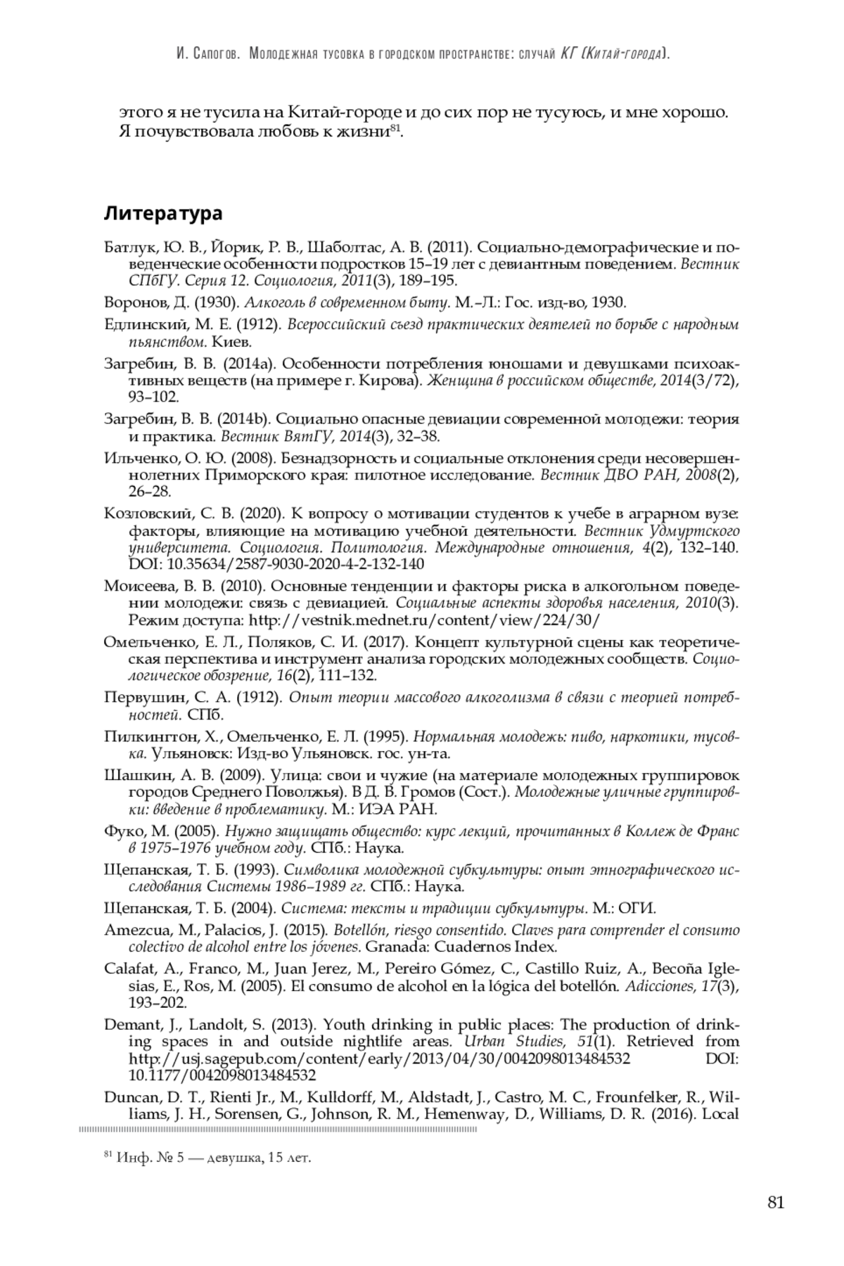 4. Загребин, В. В. (2014a). Особенности потребления юношами и девушками психоактивных веществ (на примере г. Кирова). Женщина в российском обществе, 2014(3/72), 93-102.