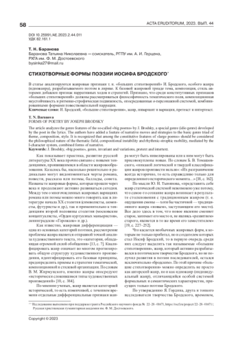 В статье анализируются жанровые признаки т. н. «больших стихотворений» И. Бродского, особого жанра (идиожанра), разрабатываемого поэтом в лирике. К базовой жанровой триаде тема, композиция, стиль авторами добавлен признак нарративных ходов и стратегий. Признано, что среди конститутивных признаков «больших стихотворений» должны рассматриваться философичность тематического поля, композиционная неустойчивость и ритмико-строфическая подвижность, опосредованные я-персонажной системой, комбинированными формами повествовательной наррации.