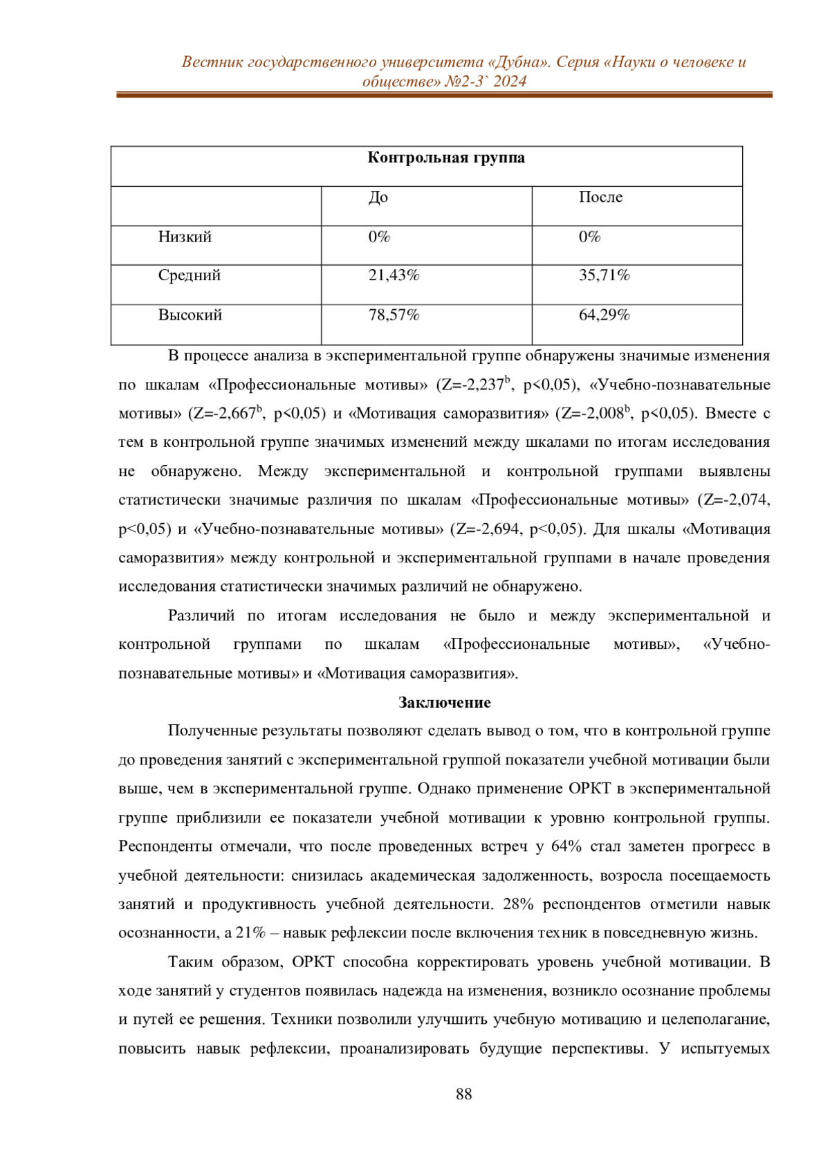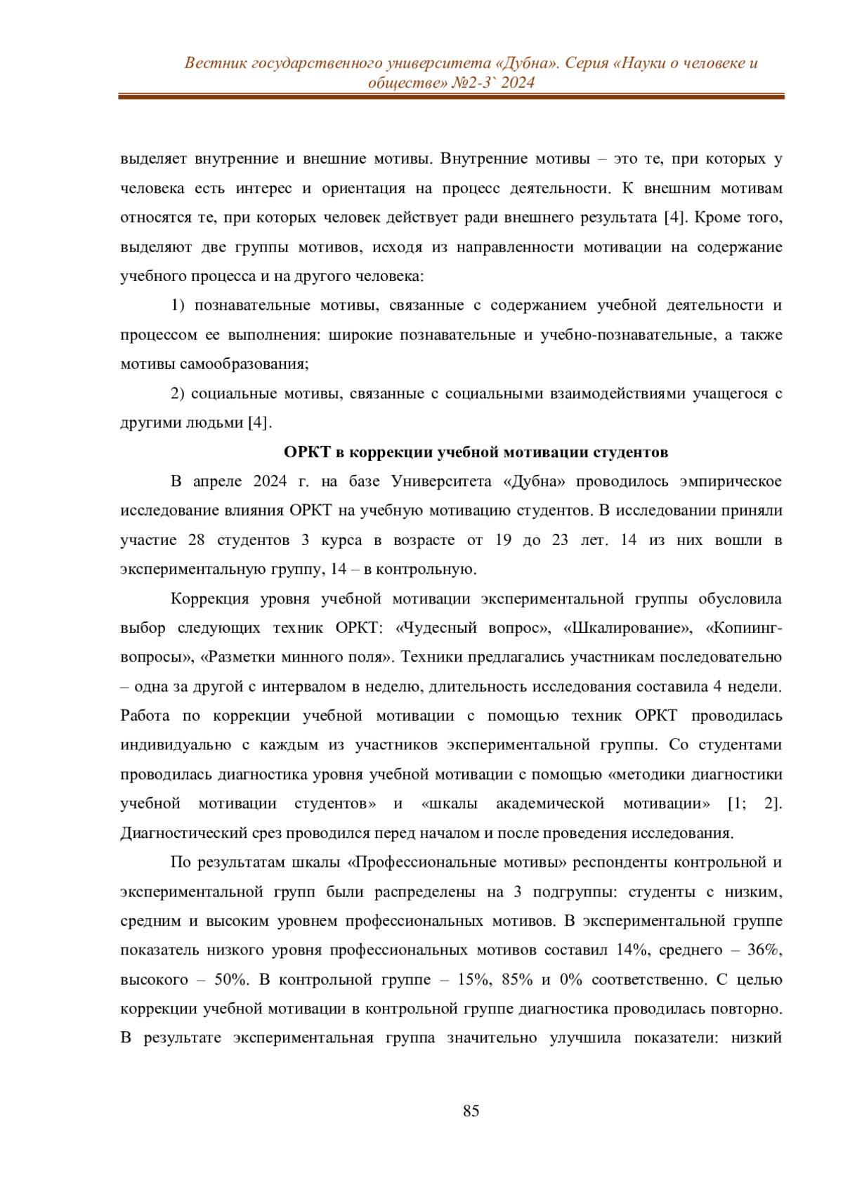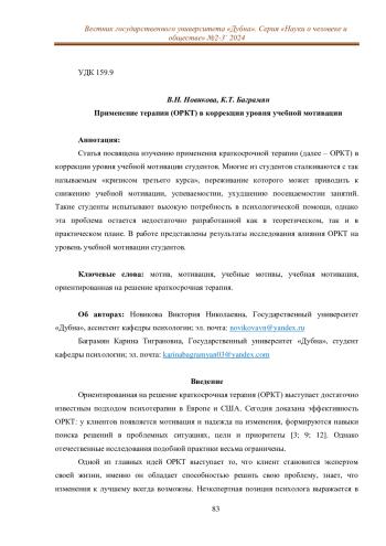 Статья посвящена изучению применения краткосрочной терапии (далее - ОРКТ) в коррекции уровня учебной мотивации студентов. Многие из студентов сталкиваются с так называемым «кризисом третьего курса», переживание которого может приводить к снижению учебной мотивации, успеваемостии, ухудшению посещаемостии занятий. Такие студенты испытывают высокую потребность в психологической помощи, однако эта проблема остается недостаточно разработанной как в теоретическом, так и в практическом плане. В работе представлены результаты исследования влияния ОРКТ на уровень учебной мотивации студентов.