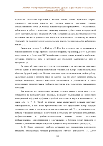 Основатели подхода С. де Шейзер и И. Ким Берг отмечают, что он применяется в решении широкого спектра проблем: в семейной терапии, терапии пар, работе с детьми и подростками и т. д. Благодаря ОРКТ вырабатывается навык поиска решений в проблемных ситуациях, появляются силы и мотивация для изменений, выстраиваются цели и приоритеты [9]. Во время обучения многие студенты сталкиваются с так называемым «кризисом третьего курса». В этот период они начинают сомневаться в выборе места и направления обучения, будущей профессии. Многим студентам приходится совмещать учебу и работу, зарабатывать деньги и находить время на занятия – все это может негативно влиять на учебную мотивацию, снижать показатели посещаемости и успеваемости, а также провоцировать психологические проблемы, нарушение сна, тревожность, депрессивные состояния.