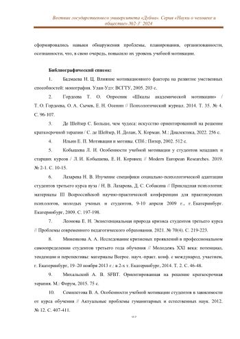 5. Кобышева Л. И. Особенности учебной мотивации у студентов младших и старших курсов / Л. И. Кобышева, Е. И. Корниец // Modern European Researches. 2019. № 2-1. С. 10-15. EDN: XPPVQW
