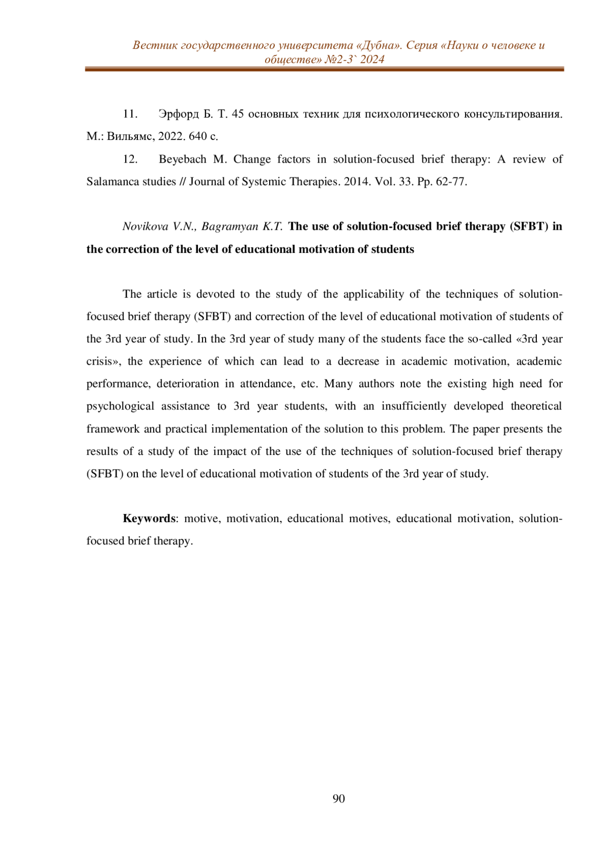 12. Beyebach M. Change factors in solution-focused brief therapy: A review of Salamanca studies // Journal of Systemic Therapies. 2014. Vol. 33. Pp. 62-77.