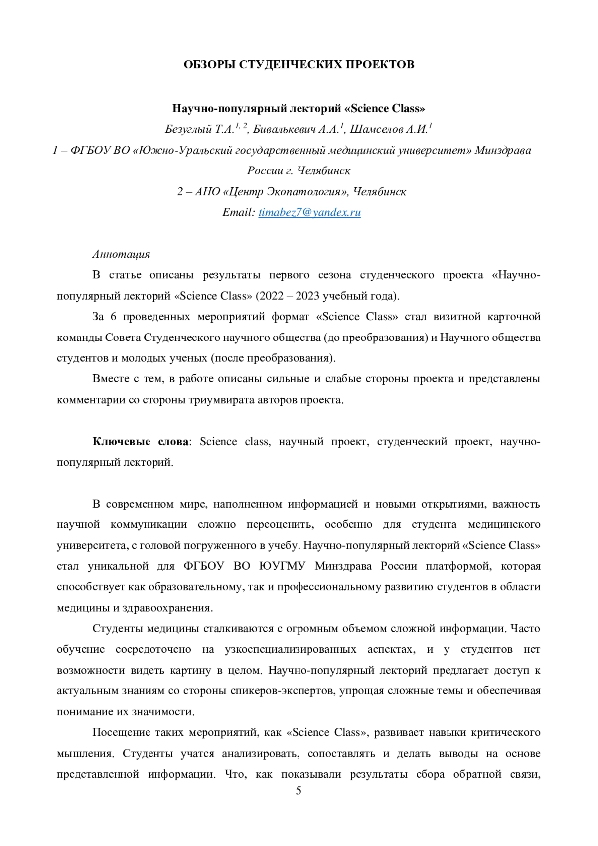 БЕЗУГЛЫЙ Т. А., БИВАЛЬКЕВИЧ А. А., ШАМСЕЛОВ А. И. НАУЧНО-ПОПУЛЯРНЫЙ ЛЕКТОРИЙ «SCIENCE CLASS» // МЕДИЦИНСКИЙ НАУЧНЫЙ ЖУРНАЛ "СИНОПСИС". 2024. № 2 (2)