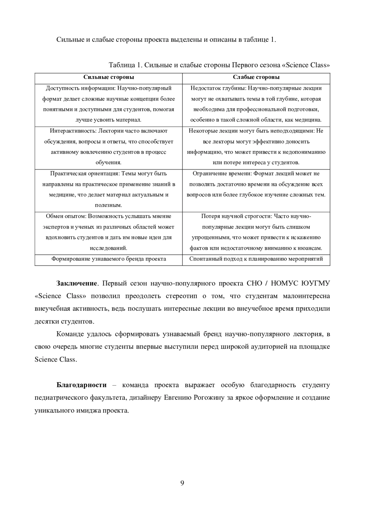 В статье описаны результаты первого сезона студенческого проекта «Научнопопулярный лекторий «Science Class» (2022 – 2023 учебный года).