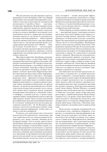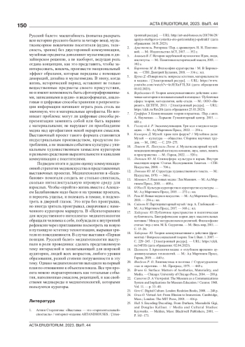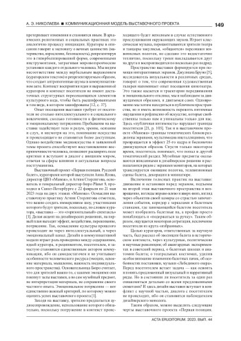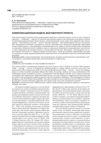 Классическая аристотелевская модель коммуникации, принятая в социальных науках, состоит из трёх элементов: адресанта - сообщения - адресата. В контексте выставочного проекта, как уникального культурного события и новой формы репрезентации художественного, коммуникационная модель может быть выражена через триаду: куратор - произведение искусства - зритель. В центре внимания - выставочный проект как поле для возможных экспериментов охватывает совокупность смыслов, символические и визуальные проявления современной художественной среды, а также формирует коммуникативное поле, требуя от зрителя особого опыта восприятия и осмысления. Медиатехнологии становятся одним из каналов для вовлечения и взаимодействия с посетителем в таких современных выставочных проектах, как выставка-путешествие «Балабанов», «Психотерапевт для искусственного интеллекта» и «Первая позиция. Русский балет». Автор рассматривает приведённые выставки со следующих позиций: принципы применения медиатехнологий, их воздействие на зрителя и коммуникативный потенциал.