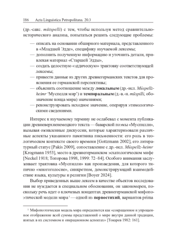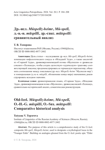 Цель настоящей статьи — осуществить всестороннее исследование древнеисландского композита Mú-spell, Múspellz-heimr, служащего для обозначения мифологического локуса в «Младшей Эдде» [Jónsson 1900; Младшая Эдда 1970], прозаическом произведении Снорри Стурлуссона, датируемом 1222–1225 гг., привести аналогии из «Старшей Эдды» [Старшая Эдда 1963], древнеисландского поэтического эпоса (основная рукопись Codex Regius, вторая половина XIII в.), а также из других ареалов древнегерманских языков — древневерхненемецкого (д.‑в.‑н. mūspilli, обозначение конца мира) и ингвеонского (др.-сакс. mūtspelli) с тем, чтобы используя метод сравнительно-исторического анализа, попытаться решить следующие проблемы: