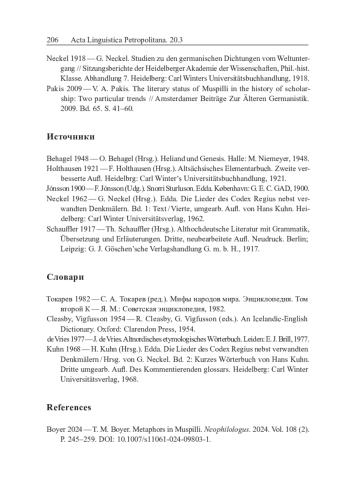 - Boyer 2024 — T. M. Boyer. Metaphors in Muspilli // Neophilologus. 2024. Vol. 108 (2). P. 245–259. DOI:10.1007/s11061-024-09803-1.