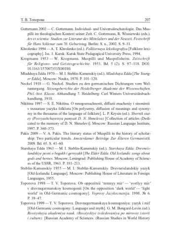 - Топорова 1999 — Т. В. Топорова. Древнегерманская космогония: язык и миф // Г. М. Бонгард-Левин (ред.). Российская академия наук. (Российские исследования по мировой истории и культуре). Т. 1. Lewiston; Queenston; Lampeter: The Edwin Mellen Press, 1999.