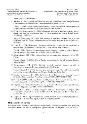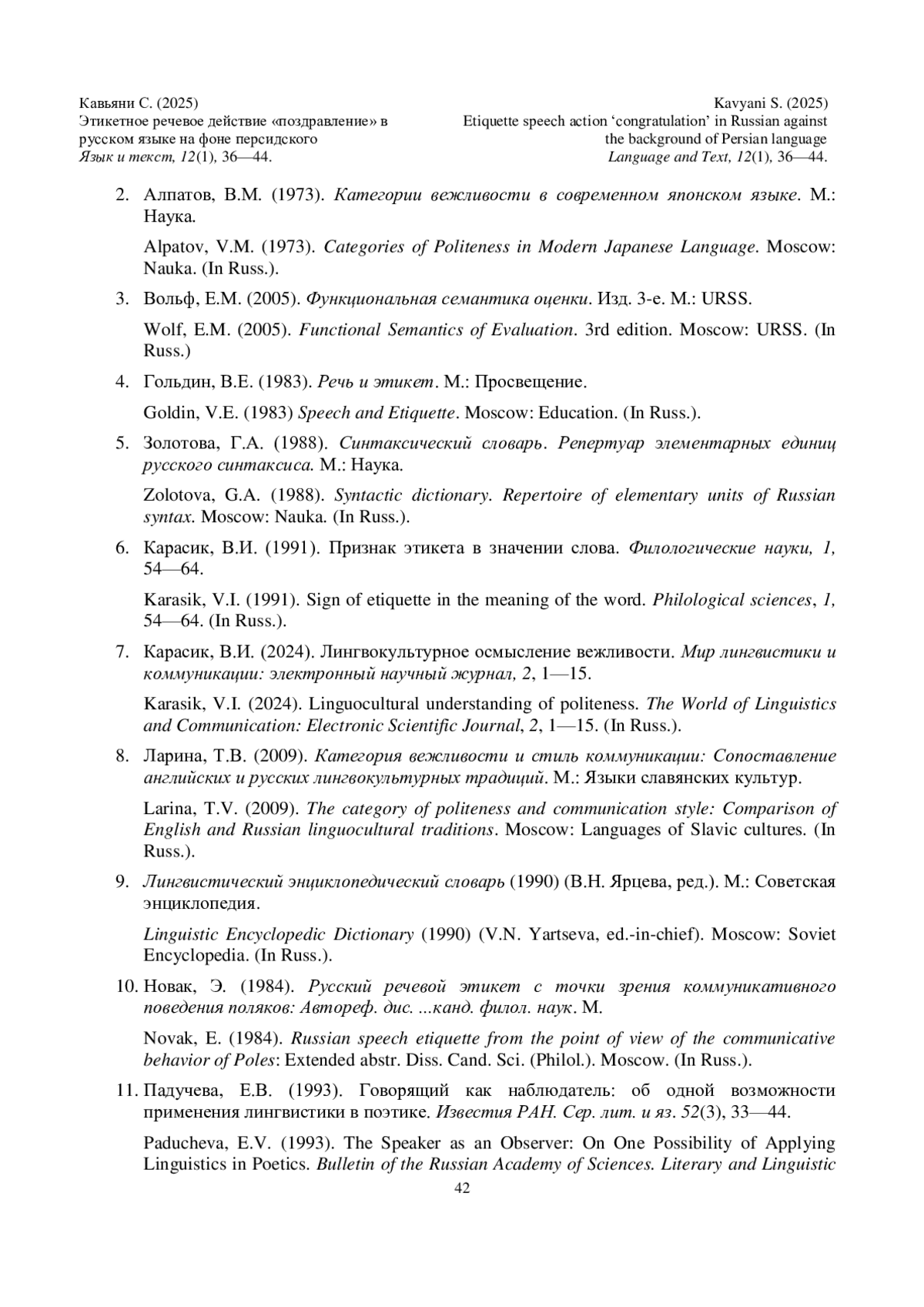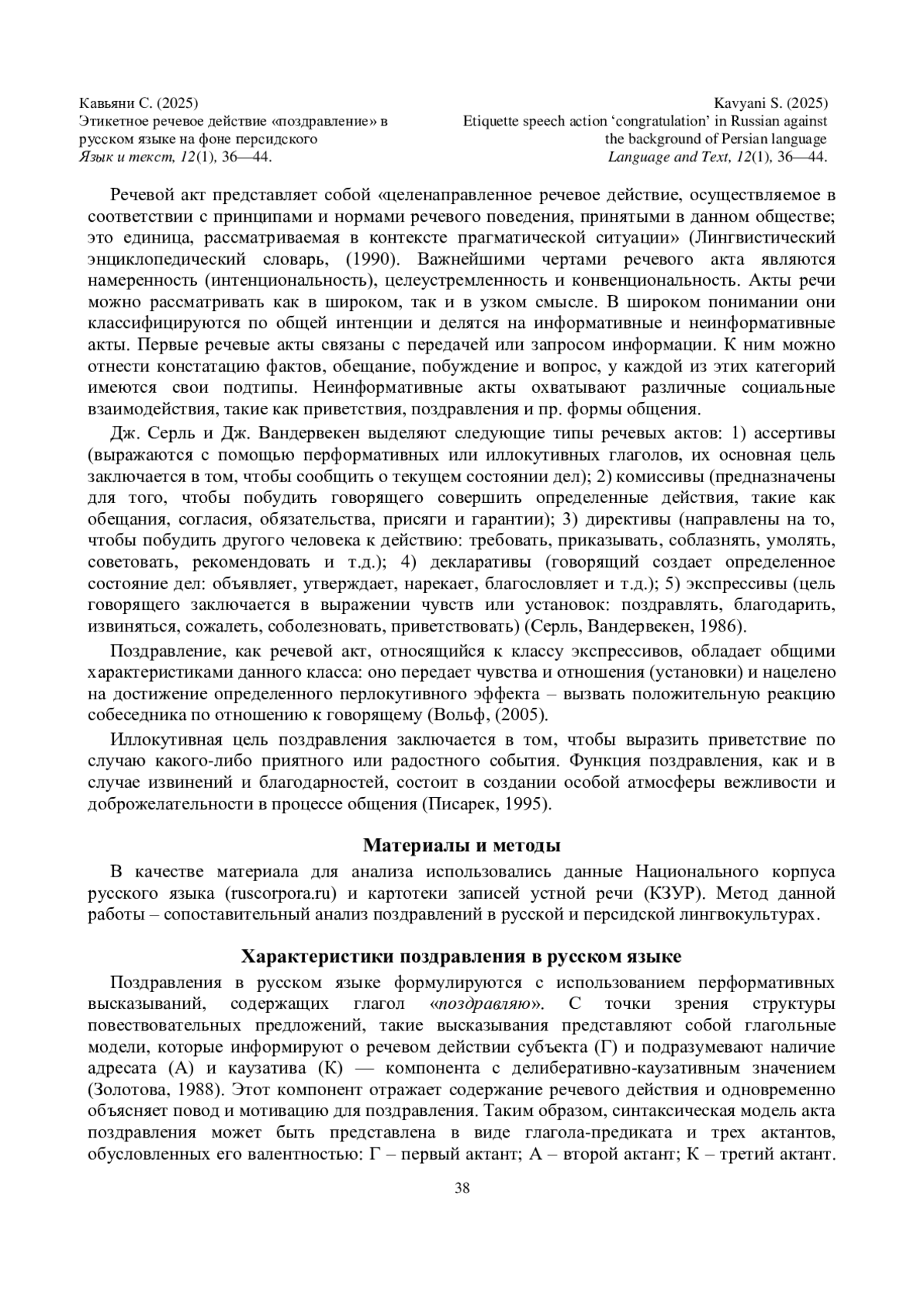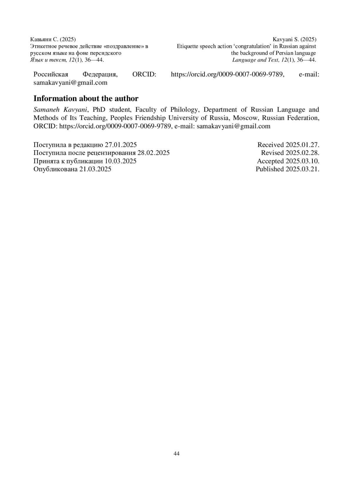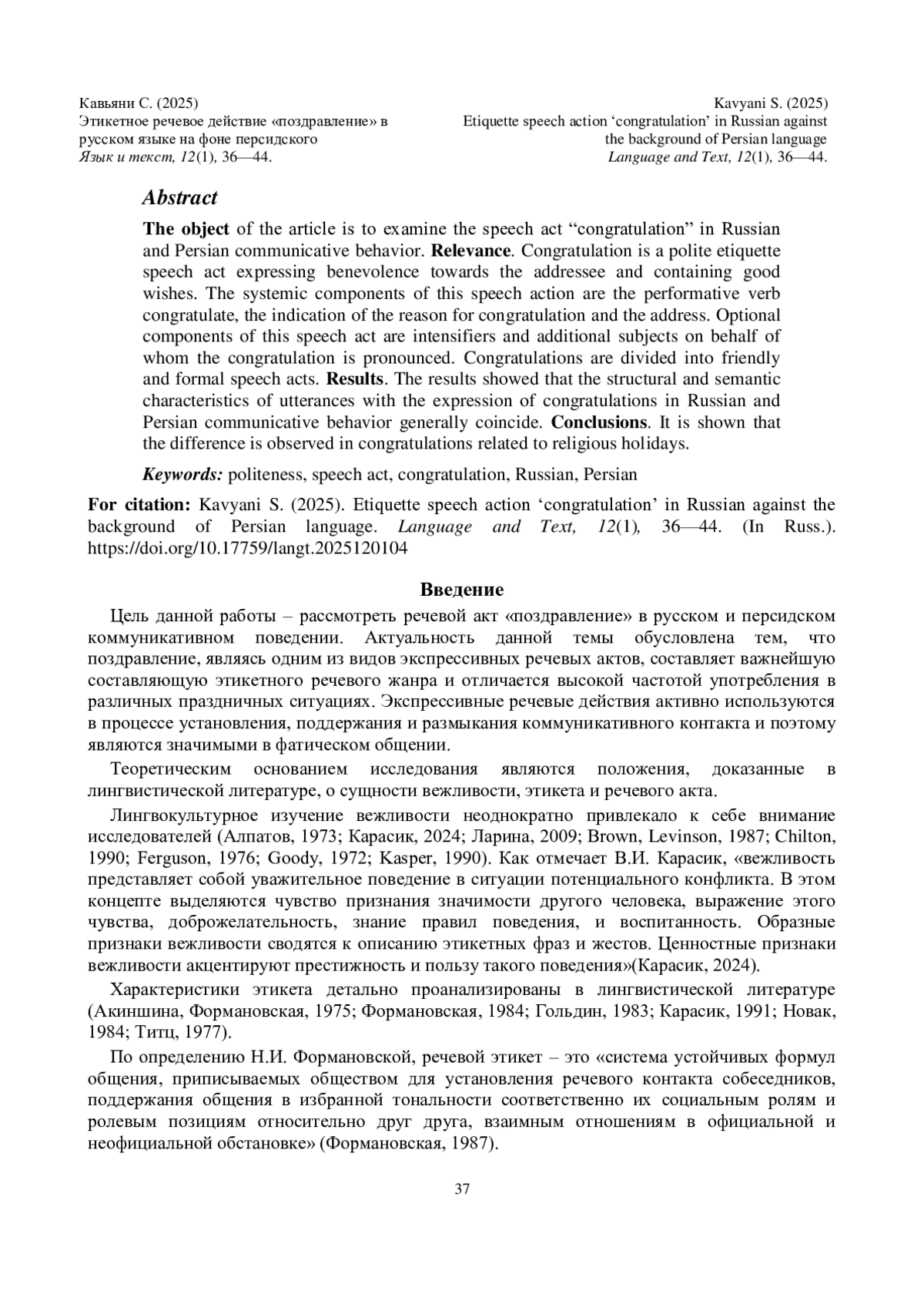 КАВЬЯНИ С. ЭТИКЕТНОЕ РЕЧЕВОЕ ДЕЙСТВИЕ «ПОЗДРАВЛЕНИЕ» В РУССКОМ ЯЗЫКЕ НА ФОНЕ ПЕРСИДСКОГО // ЯЗЫК И ТЕКСТ. 2025. Т. 12 № 1