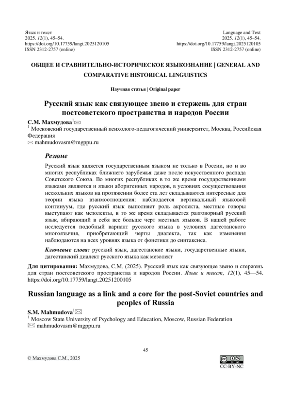 Mahmudova, S.M. (2011). Problems of functioning Russian language in Dagestan. In: VI International Congress of Russian language researchers. Russian language: history and modernity. Works and materials. Moscow: RSUH, 16-19 March 2011 (pp. 65-72) (In Russ.).
