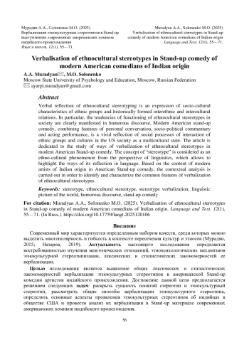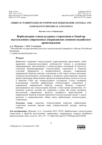Вербальное отражение этнокультурной стереотипизации представляет собой выражение социально-культурных особенностей этносов и исторически сформированных межэтнических и межкультурных отношений. В частности, тенденции функционирования этнокультурных стереотипов в обществе отчетливо проявляются в юмористическом дискурсе. Современная американская Stand-up комедия, сочетающая в себе черты личного разговора, социально-политического комментария и актерского представления, является ярким отражением общественных процессов взаимодействия этносов и культур в обществе США как поликультурного государства. Статья посвящена исследованию способов вербализации этнокультурных стереотипов в современной американской Stand-up комедии. Понятие “стереотип” рассматривается как этнокультурное явление с точки зрения лингвистики, что позволяет осветить способы его отражения в языке. На основе материала выступлений современных артистов индийского происхождения в американской Stand-up комедии проводится контекстуальный анализ с целью выделить и охарактеризовать общие черты вербализации этнокультурных стереотипов.