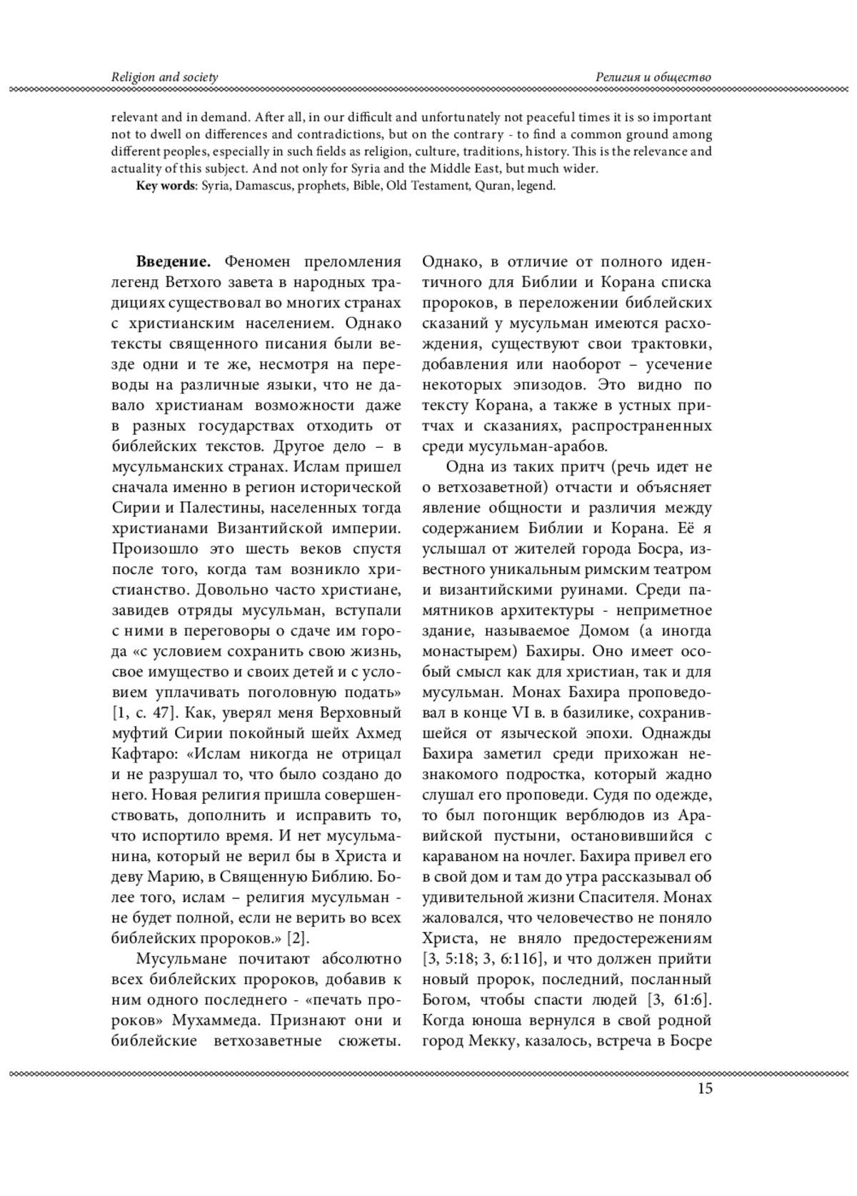 В настоящей статье автор ставит целью показать, как интерпретируются, преломляются и переосмысливаются некоторые ветхозаветные сюжеты в народных легендах и сказаниях в Сирии. При этом речь идет именно о тех эпизодах Ветхого завета, которые, по утверждению сирийцев, произошли на их земле. Поэтому в основе работы лежат проведенные автором в Сирийской Арабской Республике полевые исследования, многочисленные беседы и интервью со священнослужителями и жителями различных районов страны. В статье также приводятся фрагменты из Ветхого завета и Корана, систематизируются собранные материалы. Автор прослеживает, как дошедшие до сегодняшнего дня предания, народные притчи, повествования и коранические сюжеты соотносятся с ветхозаветными сюжетами Библии и чем отличаются от их христианской интерпретации. Упомянутые легенды и фольклор не следует принимать за неоспоримые исторические факты. Однако эти предания живут среди сирийцев и вместе с традициями передаются из поколения в поколение не один век, а вернее, уже не одно тысячелетие. Тема переплетения библейских, коранических и народных сказаний сегодня, как нам видится, может быть весьма актуальна и востребована. Ведь в наше непростое время так важно не зацикливаться на различиях и противоречиях, а наоборот - находить общее среди разных народов, особенно в таких сферах, как религия, культура, традиции, история. В этом и состоит актуальность и злободневность данной темы. Причем не только для Сирии и Ближнего Востока, но и гораздо шире.