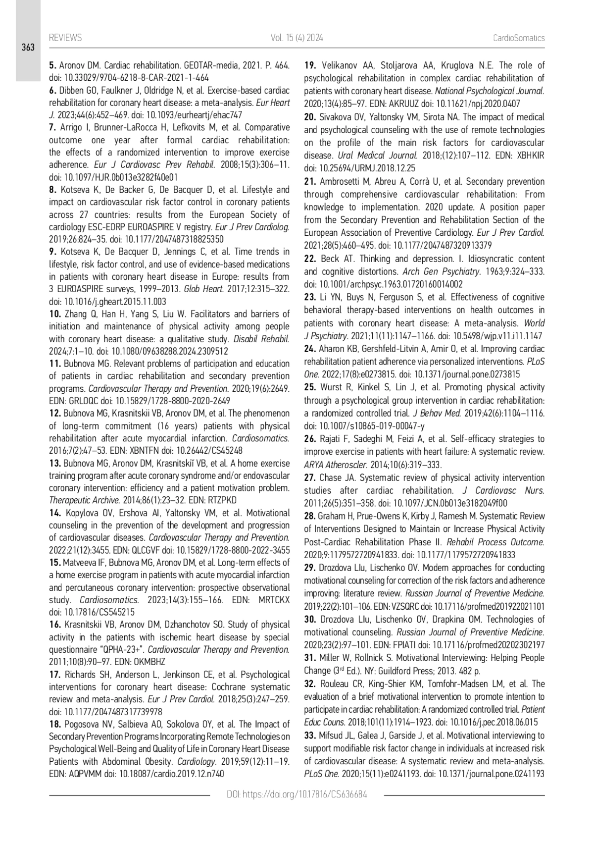14. Копылова О.В., Ершова А.И., Ялтонский В.М., и др. Мотивационное консультирование в профилактике развития и прогрессирования сердечно-сосудистых заболеваний // Кардио- васкулярная терапия и профилактика. 2022. T. 2, № 12. С. 455. EDN: QLCGVF doi: 10.15829/1728-8800-2022-3455