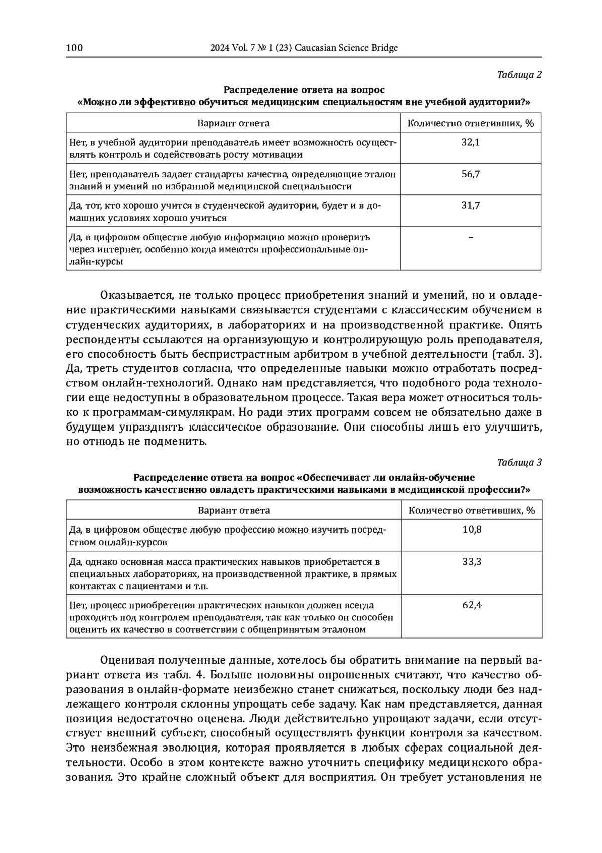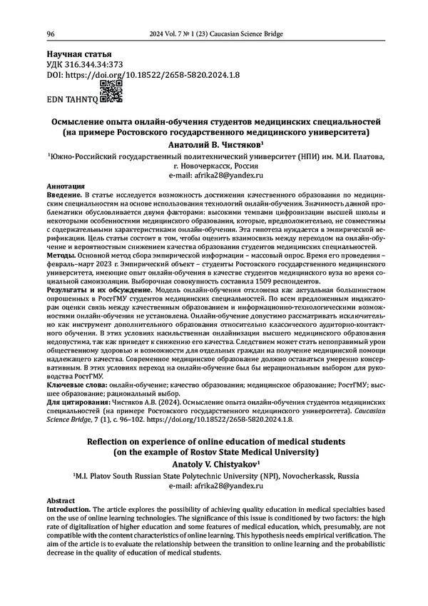 Результаты и их обсуждение. Модель онлайн-обучения отклонена как актуальная большинством опрошенных в РостГМУ студентов медицинских специальностей. По всем предложенным индикаторам оценки связь между качественным образованием и информационно-технологическими возможностями онлайн-обучения не установлена. Онлайн-обучение допустимо рассматривать исключительно как инструмент дополнительного образования относительно классического аудиторно-контактного обучения. В этих условиях насильственная онлайнизация высшего медицинского образования недопустима, так как приведет к снижению его качества. Следствием может стать непоправимый урон общественному здоровью и возможности для отдельных граждан на получение медицинской помощи надлежащего качества. Современное медицинское образование должно оставаться умеренно консервативным. В этих условиях переход на онлайн-обучение был бы нерациональным выбором для руководства РостГМУ.