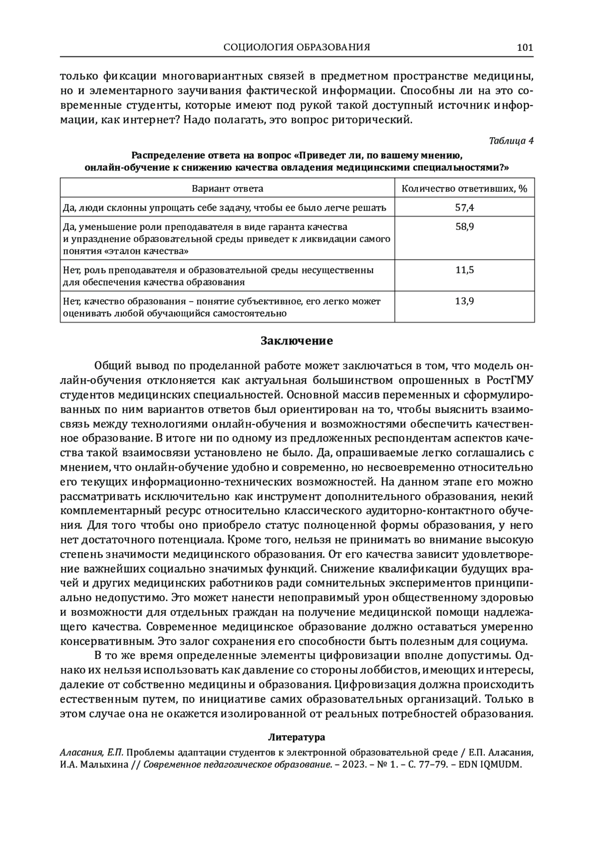 - Аласания, Е.П. Проблемы адаптации студентов к электронной образовательной среде / Е.П. Аласания, И.А. Малыхина // Современное педагогическое образование. – 2023. – № 1. – С. 77–79. – EDN IQMUDM.