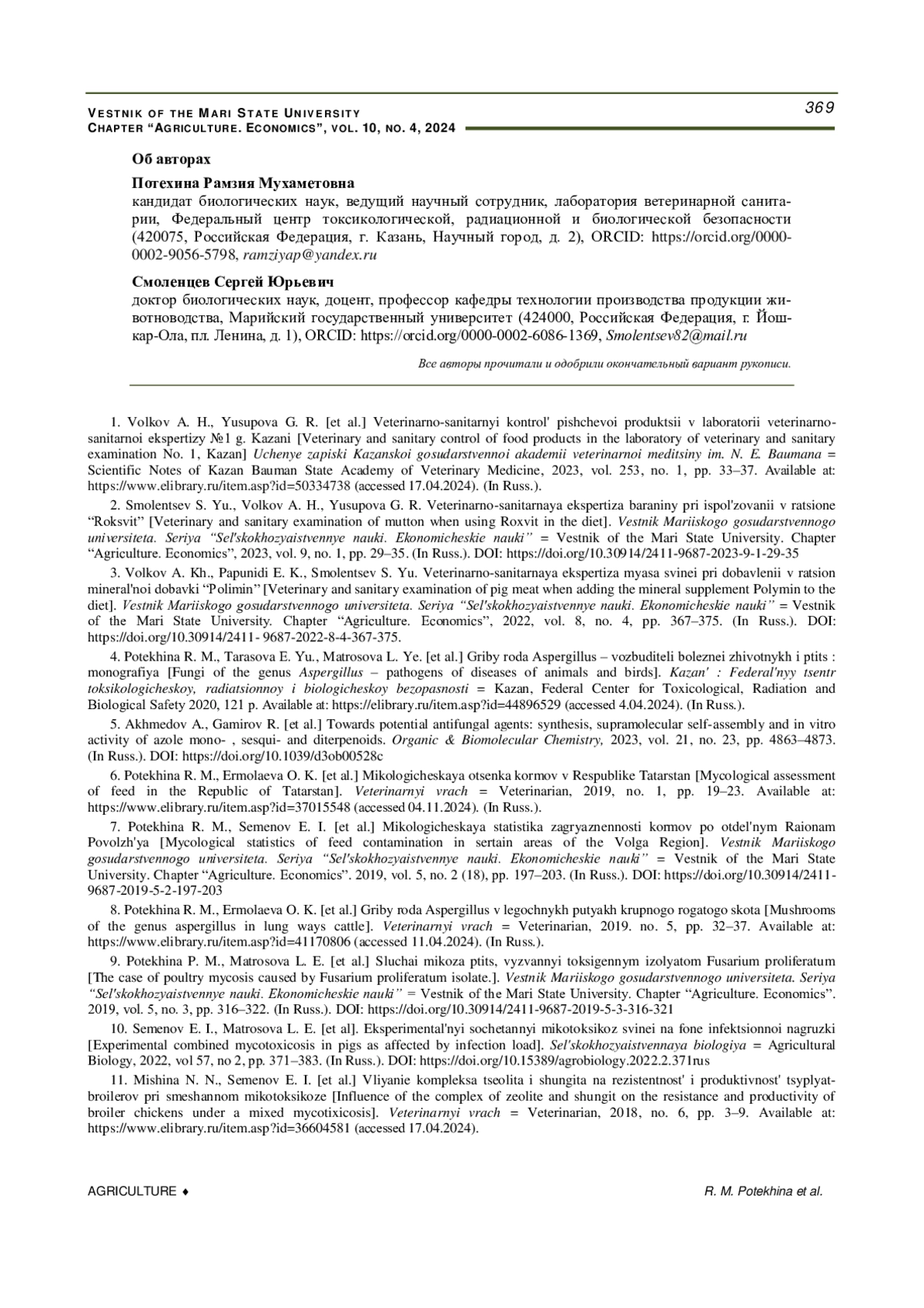 6. Микологическая оценка кормов в Республике Татарстан / Р. М. Потехина, О. К. Ермолаева [и др.] // Ветеринарный врач. 2019. № 1. С. 19-23. URL: item.asp?id=37015548 (дата обращения: 11.04.2024). EDN: YYAFVJ