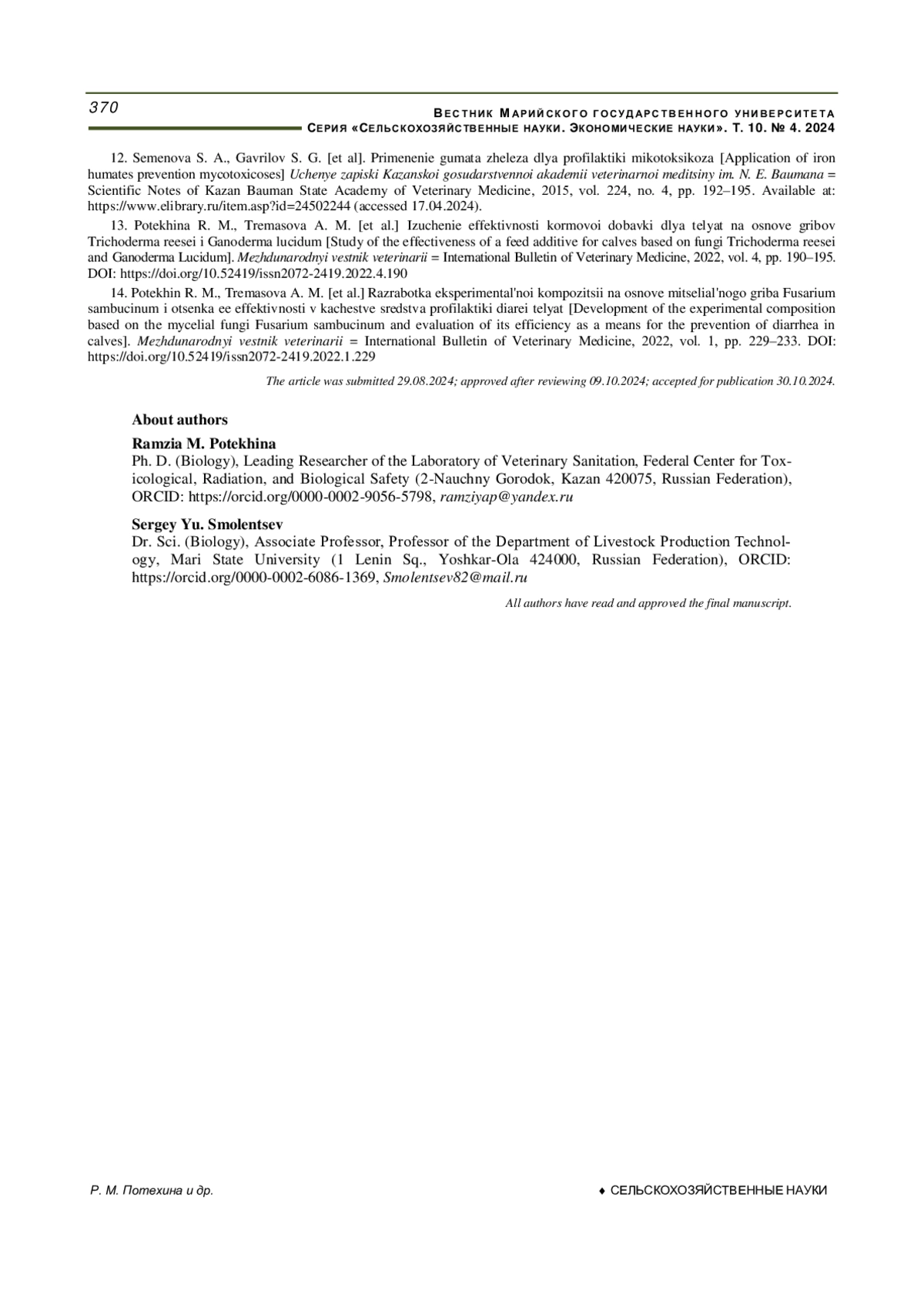 14. Разработка экспериментальной композиции на основе мицелиального гриба Fusarium sambucinum и оценка ее эффективности в качестве средства профилактики диареи телят / Р. М. Потехина, А. М. Тремасова, [и др.] // Международный вестник ветеринарии. 2022. № 1. С. 229-233. DOI: 10.52419/issn2072-2419.2022.1.229 EDN: RYFAZR