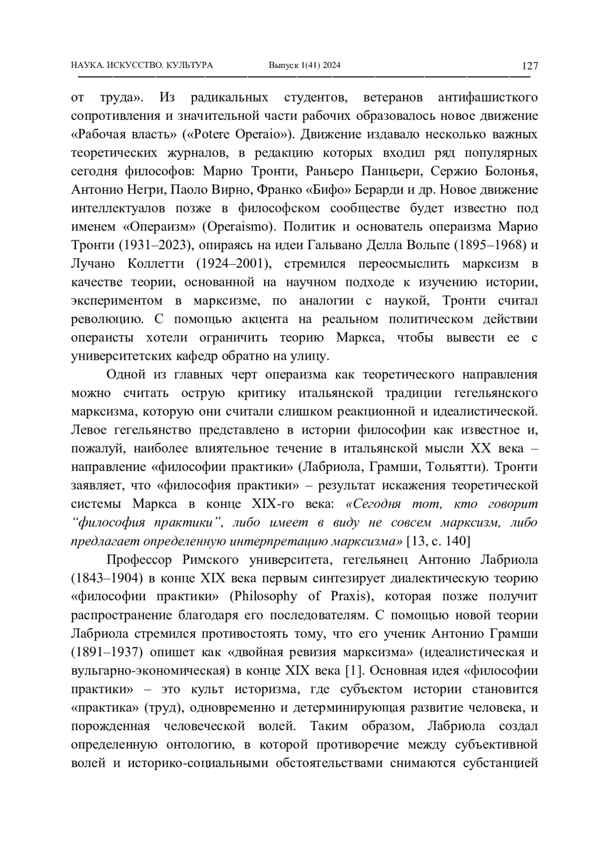 13. Tronti, M. Tra materialismo dialettico e filosofia della prassi: Gramsci e Labriola / M. Tronti // Saggi sulla figura e il pensiero di Antonio Gramsci; eds. A. Caracciolo and G. Scalia. - Milano: Feltrinelli, 1959. - Pp. 139-162.